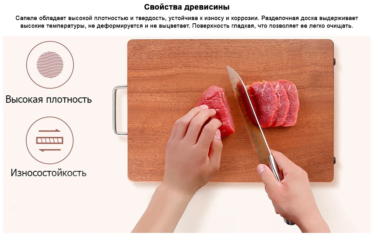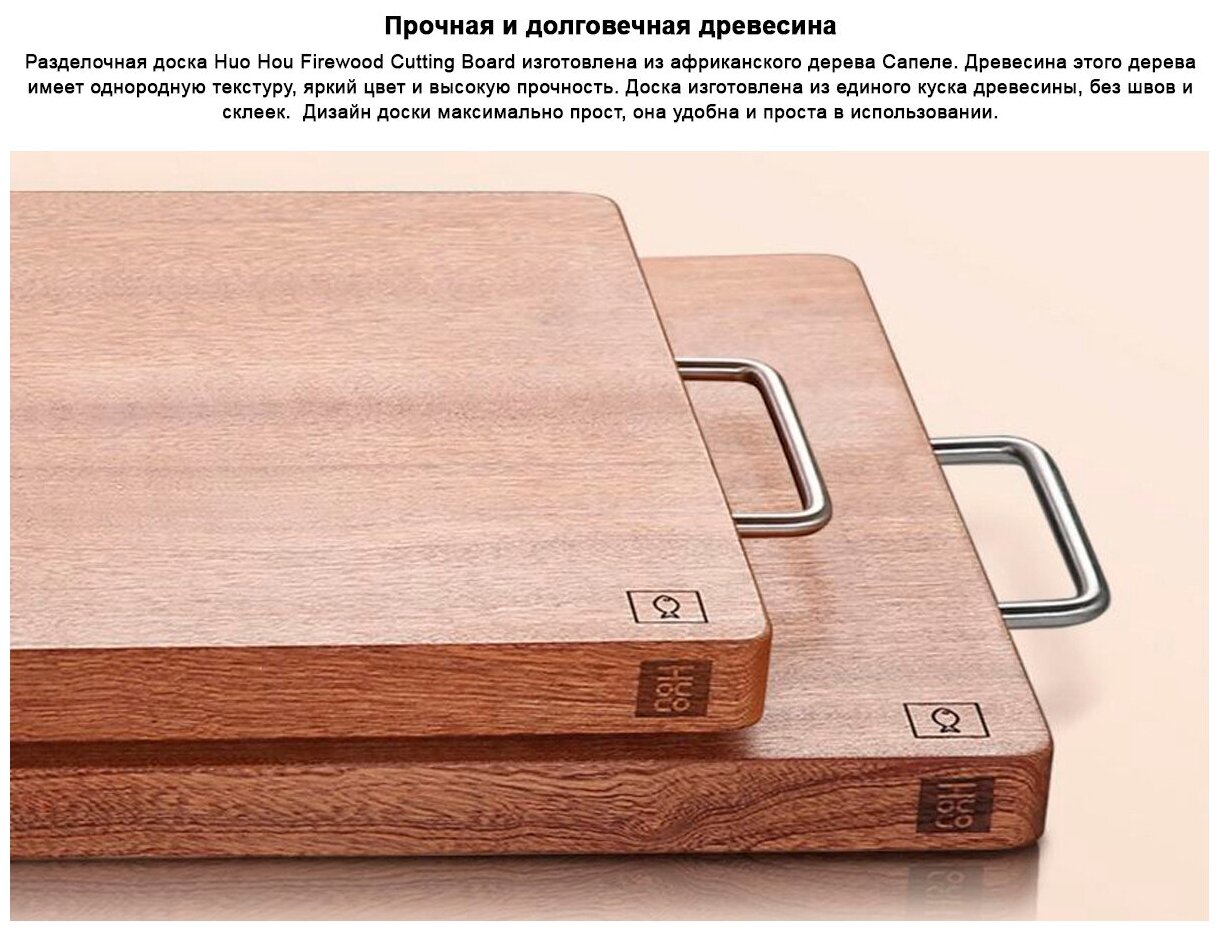 HuoHou Firewood Ebony Wood Cutting Board (HU0018) выполнена из Sapele, импортированной из Африки. Из каждого куска дерева можно сделать не более 20 разделочных досок. Древесина сапеле - драгоценная древесина, с прекрасной однородной текстурой и ярким цветом, из нее делаются разделочные доски простой и прочной текстуры. Сапеле обладает высокой плотностью, твердостью, прочностью и износостойкостью. Обладая противогрибковым свойством, обеспечивает защиту от размножения бактерий.