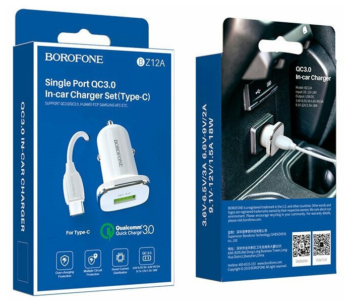 Автомобильное зарядное устройство BZ12A поддерживает функцию быстрой зарядки (QC3.0 / QC2.0, Huawei FCP, Samsung AFC и другие протоколы зарядки.). Имеет многоуровневую защиту, сделана из огнеупорного материала. Автомобильная зарядка идентифицирует устройство и автоматически регулирует выходную мощность.Вход: 120-240V.Выход: 3.6V – 6.5V / 3A, 6.6V – 9V / 2A, 9.1V – 12V / 1.5A,Мощность -18W.