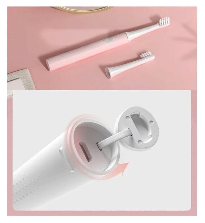 Xiaomi Mijia Sonic Electric Toothbrush T100 – электрическая зубная щётка. Встроенная защита соответствующая стандарту IPX7. Также в зубную щётку встроен литий-ионный аккумулятор, который при полном заряде может работать месяц. Благодаря компактным размерам и небольшому весу и месяц автономной работы, её удобно брать с собой в поездки. Она обеспечивает эффективную чистку зубов и массаж десен. Имеет два режима работы: обычная, деликатная.