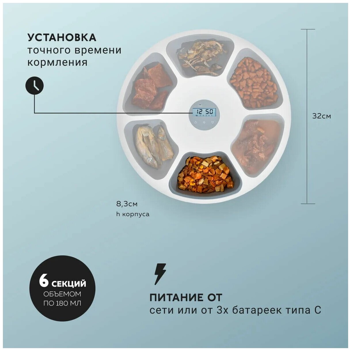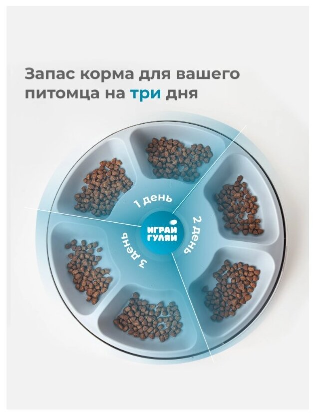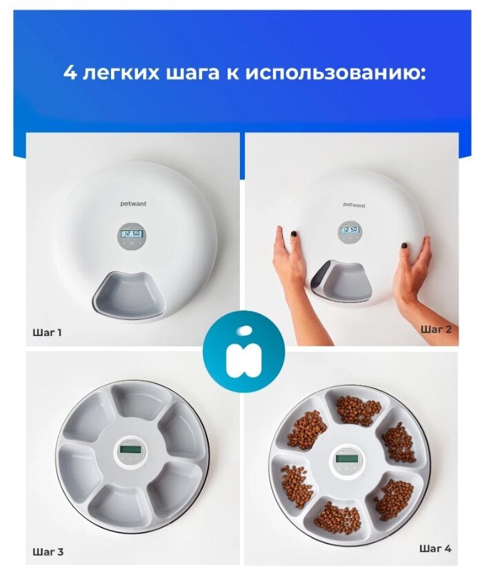 Petwant F6 - уникальная автоматическая кормушка для сухих и влажных кормов на 6 порций, которая обеспечит кошек, маленьких и средних собак свежей едой в течение всего дня! 6 секций по 180 мл Основные функции Подходит для сухого и влажного корма - каждая порция будет сюрпризом для вашего питомца. Сенсорное кнопочное управление. Резервный источник питания: кабель micro USB + резервный источник питания 3 батарейки C (батарейки в комплект не входят). ЖК-дисплей и система программируемых настроек: дисплей показывает состояние батареи, время, расписание и настройки графика кормления. Защита лап домашних животных: если кошка или собака кладут лапу в лоток с едой, дозатор перестанет вращаться, чтобы защитить домашних животных от травм. Простой дизайн: особый инновационный дизайн в белом цвете. Нескользящая нижняя поверхность: предотвращает перемещение автокормушки по полу. Размеры: 320 * 320 * 82 мм Вес: 1,35 кг Размер подарочной коробки: 35,5 * 10,4 * 36 см