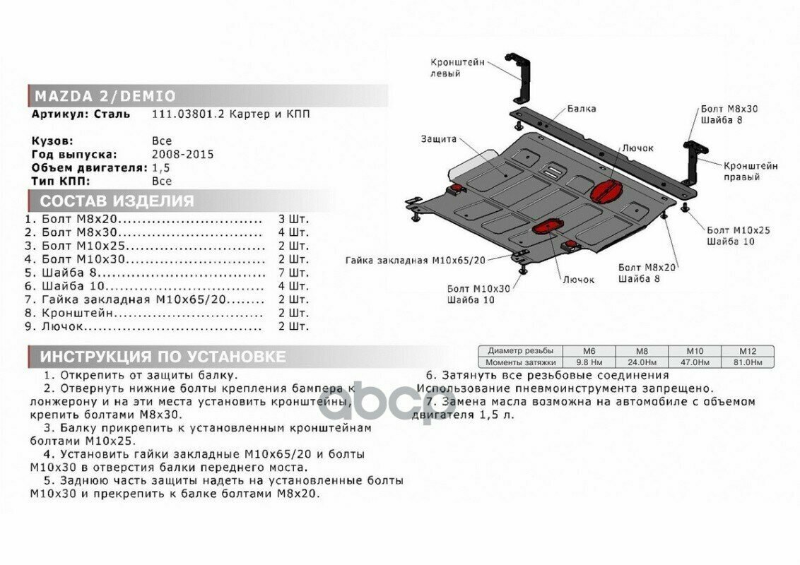 Защита картера и КПП Автоброня для Mazda 2, V - 1,5 2008-2015Mazda Demio, V - 1,5 2008-2015, сталь 2 мм., комплект крепежа,