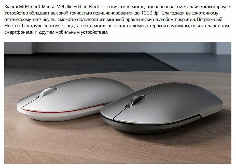 Xiaomi Mi Elegant Mouse Metallic Edition Black — оптическая мышь, выполненная в металлическом корпусе. Устройство обладает высокой точностью позиционирования до 1000 dpi. Благодаря высокоточному оптическому датчику вы сможете пользоваться мышкой практически на любом покрытии. Встроенный Bluetooth-модуль позволяет подключать мышь не только к компьютерам и ноутбукам, но и к планшетам, смартфонами и другим мобильным устройствам.