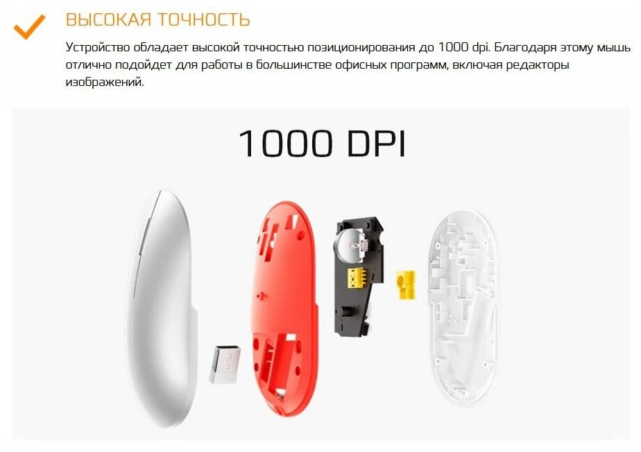 Устройство обладает высокой точностью позиционирования до 1000 dpi. Благодаря этому мышь отлично подойдет для работы в большинстве офисных программ, включая редакторы изображений.