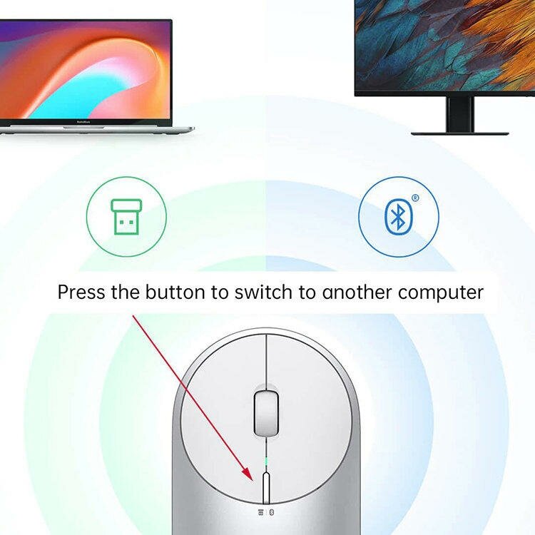 Xiaomi Mi Portable Mouse 2 Silver– новое поколение популярной беспроводной мыши Xiaomi с двойным подключением по USB или Bluetooth. Вы сможете легко переключаться между двумя компьютерами, просто нажимая кнопку переключения режима на верхней части мыши. Мышь оснащена кнопками с низким уровнем шума. Корпус выполнен из анодированного алюминия, подвергнутого пескоструйной обработке в эргономичном дизайне. Оснащена чувствительным оптическим датчикам в 4000 DPI. Совместима с компьютерами на ОС Windows и Mac OS.