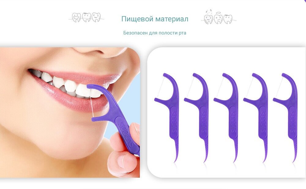Одним лёгким движением удаляет остатки пищи между зубами. Скапливающиеся между зубами остатки пищи могут создать благоприятную среду для развития бактерий, которые вызывают неприятный запах, кариес, пародонтоз и другие болезни полости рта. Ежедневная чистка с использованием зубной щетки помогает очистить поверхность зубов, а зубная нить проникает глубоко между зубов, чтобы добиться идеальной чистоты полости рта. В зубной нити Soocas используется безопасное полиэтиленовое волокно.Благодаря его высочайшей прочности, из него также изготавливают бронежилеты. Всего одна нить способна выдержать нагрузку до 3.15 кг, а мягкость и гладкость волокон не навредит дёснам во время чистки.