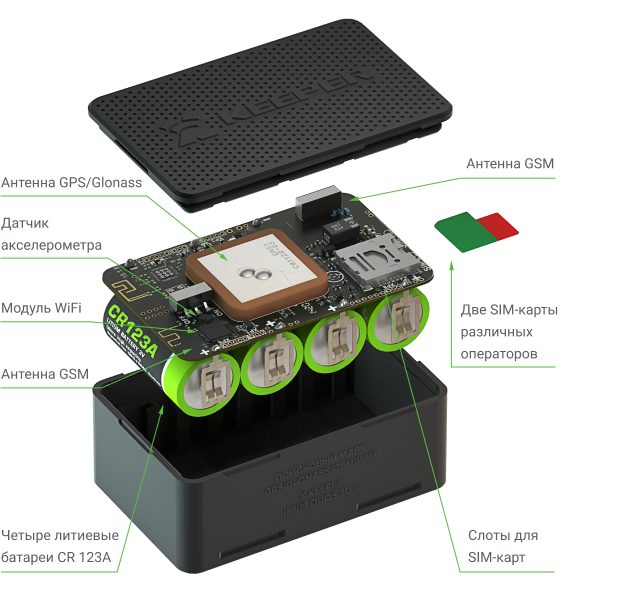 | Комплект поставки | Спутниковое устройство / Комплект элементов питания CR 123A / Комплект из двух SIM-карт разных операторов / Двухсторонний скотч / Карточка памятка |