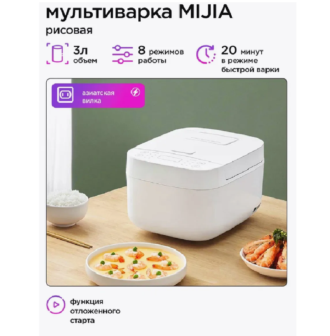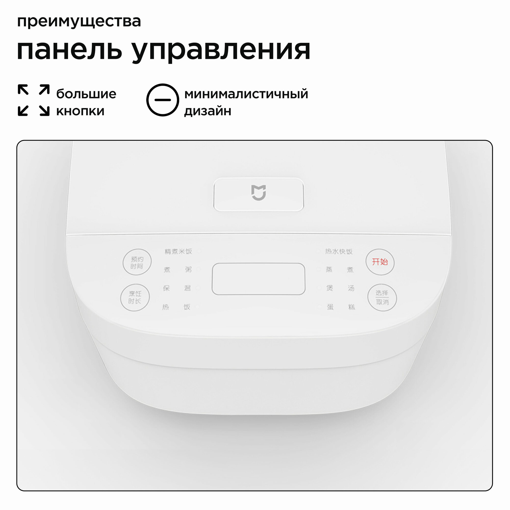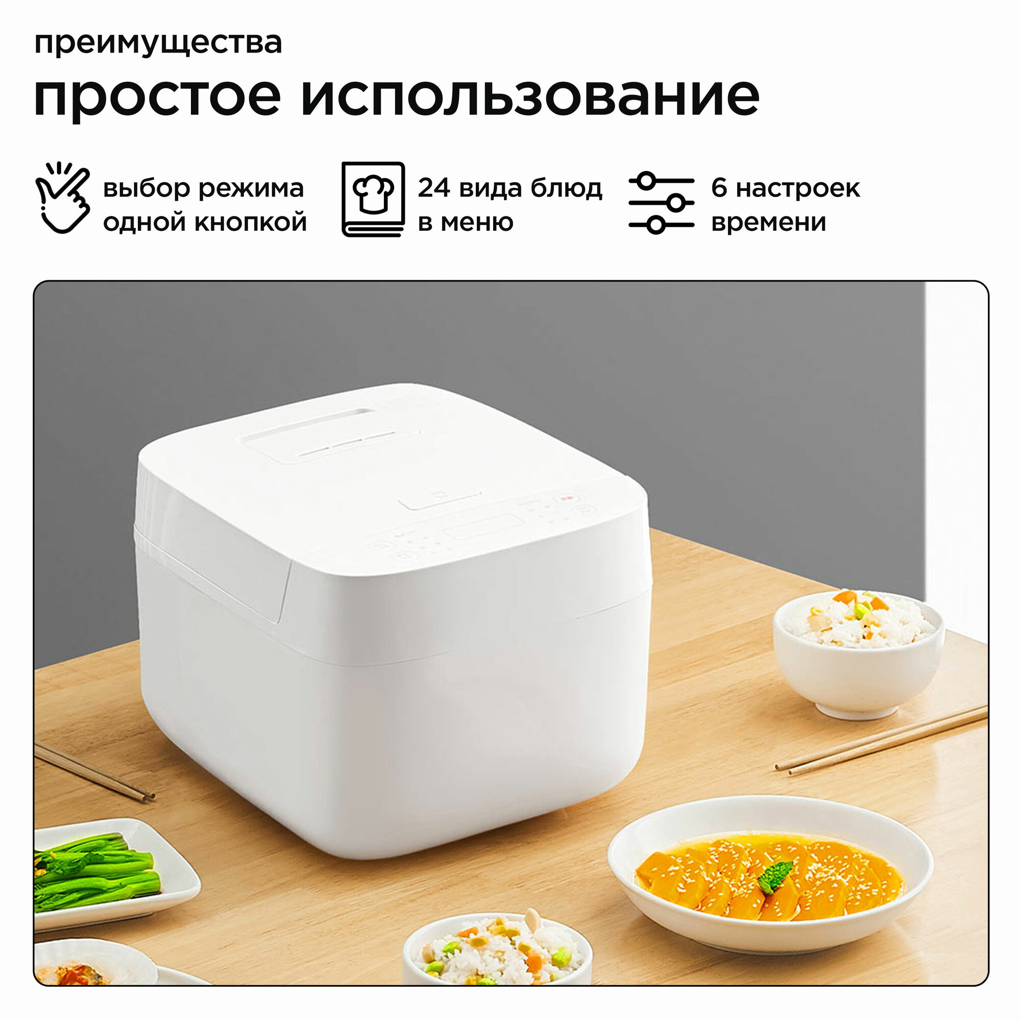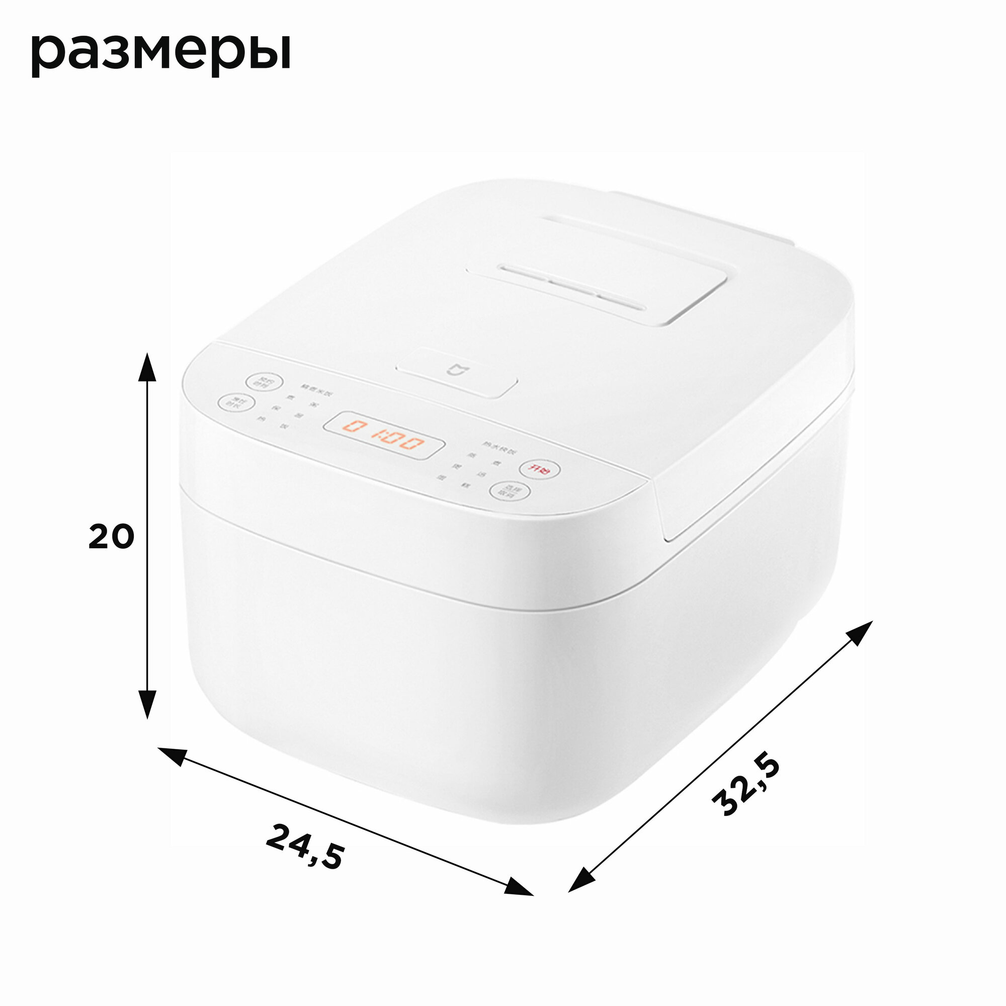 Объем 1.6 л для легкого приготовления Рисоварка Mijia за один цикл работы может приговорить сразу 6 чашек риса, каши или даже небольшой торт. С ней можно насладиться свежими продуктами, не тратя сил и времени на их приготовление, доверив все это умному устройству. Компактный корпус и тщательное исполнение Рисоварка Mijia не занимает много места и не требует сложной установки. Более того, благодаря компактному корпусу приготовленные блюда можно есть прямо из нее. 400 Вт - мощный нагрев и динамический контроль температуры Для разных режимов приготовления используется функция динамического контроля выходной мощности. Например, для быстрого приготовления риса требуется полная мощность, а чтобы добиться более нежного и мягкого вкуса, лучше подойдёт медленное приготовление. Умное приготовление разных сортов помогает раскрыть вкус От обычного длиннозерного и до экзотического тайского - умная рисоварка Mijia может подобрать оптимальный режим приготовления для более чем 3000 сортов риса, полностью раскрывая уникальный вкус каждого из них. При длительном приготовлении на низкой температуре рис лучше насыщается водой и становится мягче, а быстрое приготовление на высокой мощности делает зёрнышки более упругими. Двойной датчик температуры для строгого соблюдения режима приготовления Датчики температуры расположены как под котелком, так и над ним. Они постоянно следят за температурой приготовления и автоматически подстраивают ее под выбранный режим, чтобы рис был приготовлен правильно. Котелок со стенками толщиной 1.7 мм легко чистится и равномерно распределяет температуру Толстый пятислойный котелок имеет особое антипригарное покрытие. Его высокое качество исполнения способствует равномерному распределению температуры при нагреве, а за его антипригарным покрытием легко ухаживать. Множество рецептов в приложении Прямо из приложения Mi Home можно выбрать интересный рецепт и начать удаленное приготовление. Умное подключение открывает ещё больше вкусных и здоровых блюд. Умный таймер на 24 часа и поддержание температуры весь день Чтобы каждый день начинать с горячего завтрака, у рисоварки предусмотрена функция таймера и поддержания температуры, работающие с любым режимом приготовления.