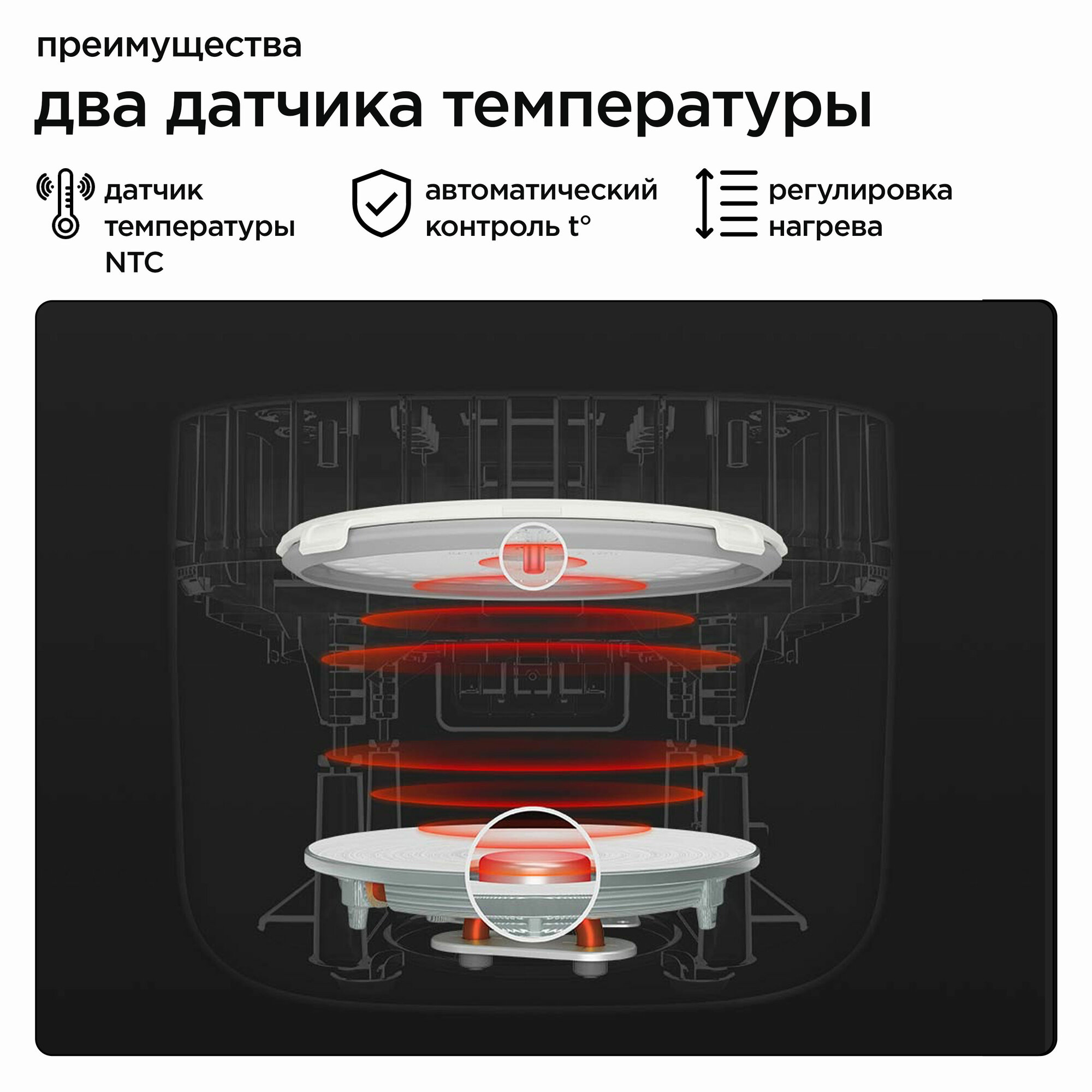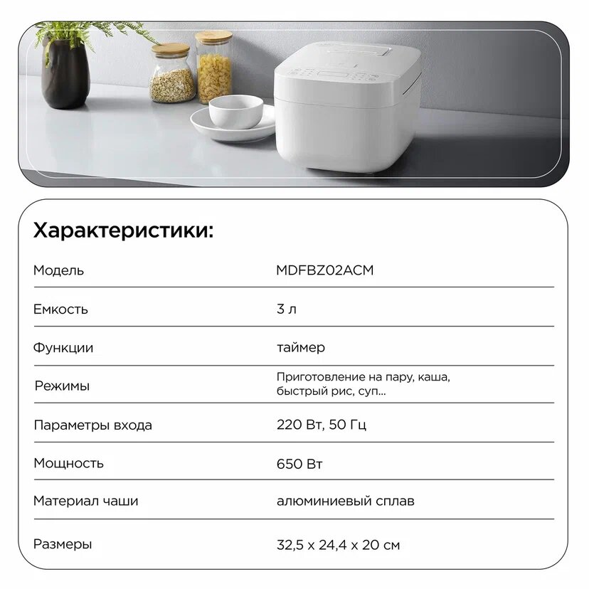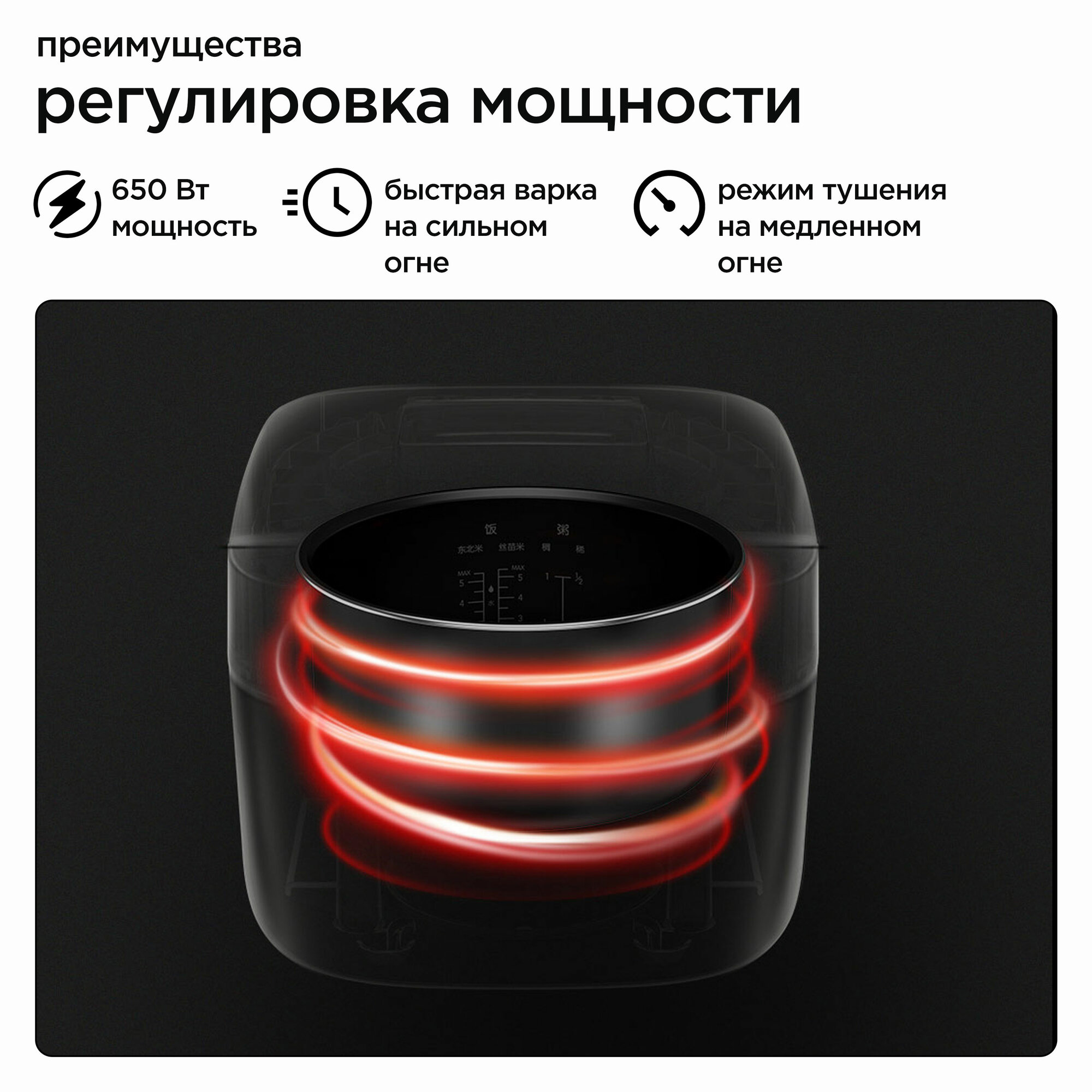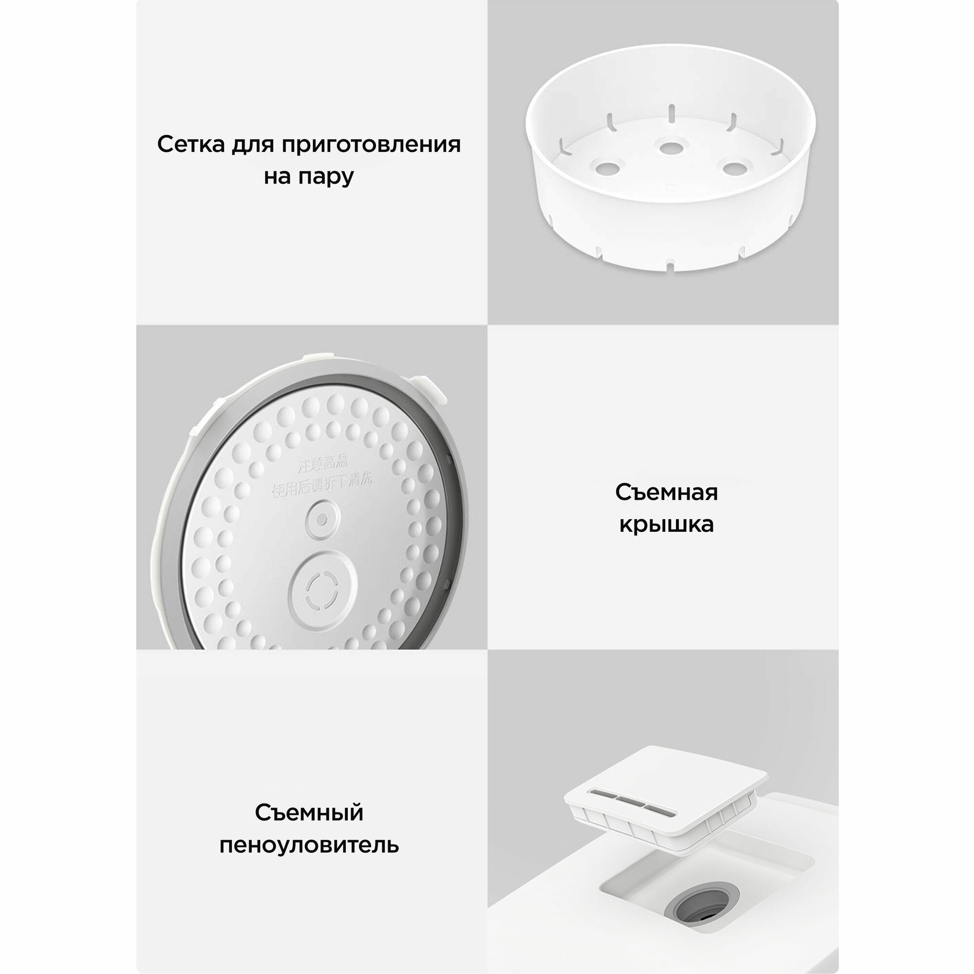Объем 1.6 л для легкого приготовления Рисоварка Mijia за один цикл работы может приговорить сразу 6 чашек риса, каши или даже небольшой торт. С ней можно насладиться свежими продуктами, не тратя сил и времени на их приготовление, доверив все это умному устройству. Компактный корпус и тщательное исполнение Рисоварка Mijia не занимает много места и не требует сложной установки. Более того, благодаря компактному корпусу приготовленные блюда можно есть прямо из нее. 400 Вт - мощный нагрев и динамический контроль температуры Для разных режимов приготовления используется функция динамического контроля выходной мощности. Например, для быстрого приготовления риса требуется полная мощность, а чтобы добиться более нежного и мягкого вкуса, лучше подойдёт медленное приготовление. Умное приготовление разных сортов помогает раскрыть вкус От обычного длиннозерного и до экзотического тайского - умная рисоварка Mijia может подобрать оптимальный режим приготовления для более чем 3000 сортов риса, полностью раскрывая уникальный вкус каждого из них. При длительном приготовлении на низкой температуре рис лучше насыщается водой и становится мягче, а быстрое приготовление на высокой мощности делает зёрнышки более упругими. Двойной датчик температуры для строгого соблюдения режима приготовления Датчики температуры расположены как под котелком, так и над ним. Они постоянно следят за температурой приготовления и автоматически подстраивают ее под выбранный режим, чтобы рис был приготовлен правильно. Котелок со стенками толщиной 1.7 мм легко чистится и равномерно распределяет температуру Толстый пятислойный котелок имеет особое антипригарное покрытие. Его высокое качество исполнения способствует равномерному распределению температуры при нагреве, а за его антипригарным покрытием легко ухаживать. Множество рецептов в приложении Прямо из приложения Mi Home можно выбрать интересный рецепт и начать удаленное приготовление. Умное подключение открывает ещё больше вкусных и здоровых блюд. Умный таймер на 24 часа и поддержание температуры весь день Чтобы каждый день начинать с горячего завтрака, у рисоварки предусмотрена функция таймера и поддержания температуры, работающие с любым режимом приготовления.
