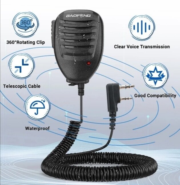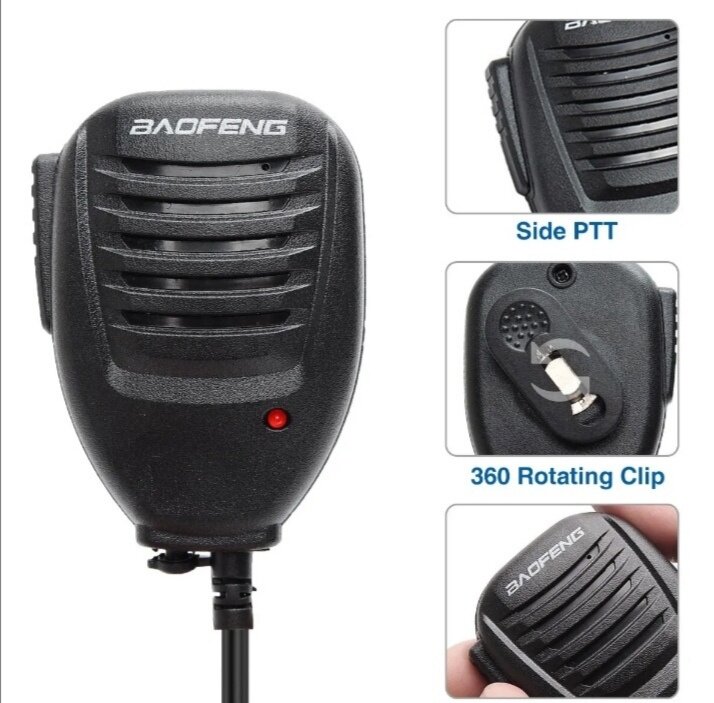 Тангента Baofeng Shoulder Speaker Mic подойдет для всех радиостанций с разъемом 2-Pin. Она подойдет для охотников, любителей активного отдыха, автомобилистов и спецслужб. Корпус манипулятора выполнен из качественного черного пластика и имеет эргономичную форму, удобно ложиться в ладонь. Кнопка тангенты удобно расположена для нажатия указательным и средним пальцем руки. На лицевой поверхности имеется ребристая решетка прикрывающая динамик манипулятора, в правом верхнем углу решетки имеется отверстие микрофона, в нижней части индикаторный светодиод.