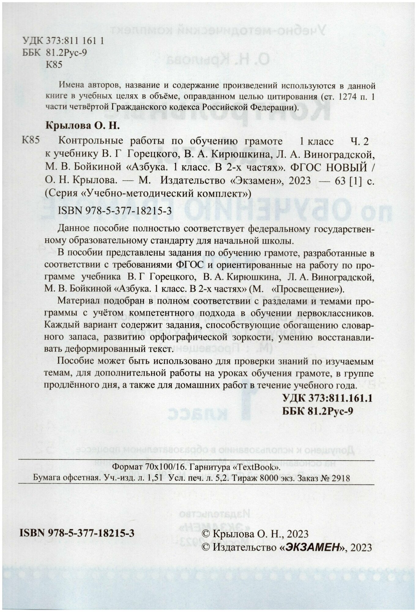 Азбука. 1 класс. Контрольные работы по обучению грамоте к учебнику В.Горецкого В.Кирюшкина. Часть 2 (Крылова Ольга Николаевна); Экзамен Издательство, 2023