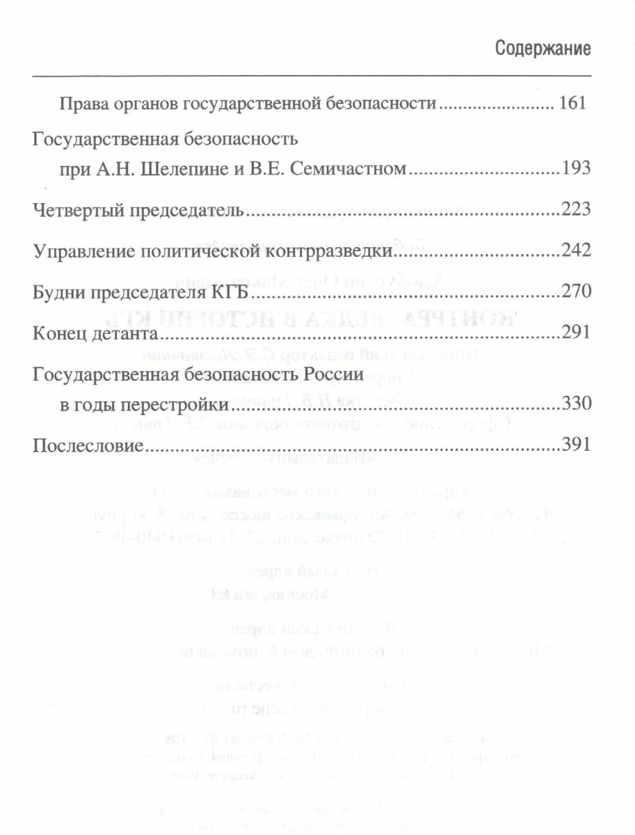 Книга раскрывает историю зарождения и становления контрразведки России в ХХ веке как одного из средств обеспечения национальной безопасности. Особое внимание уделяется истории глобального противостояния США с «большой Россией» в годы холодной войны 1946—1991 годов.