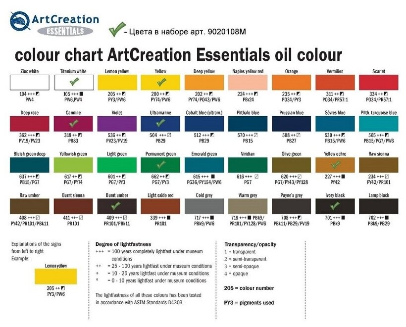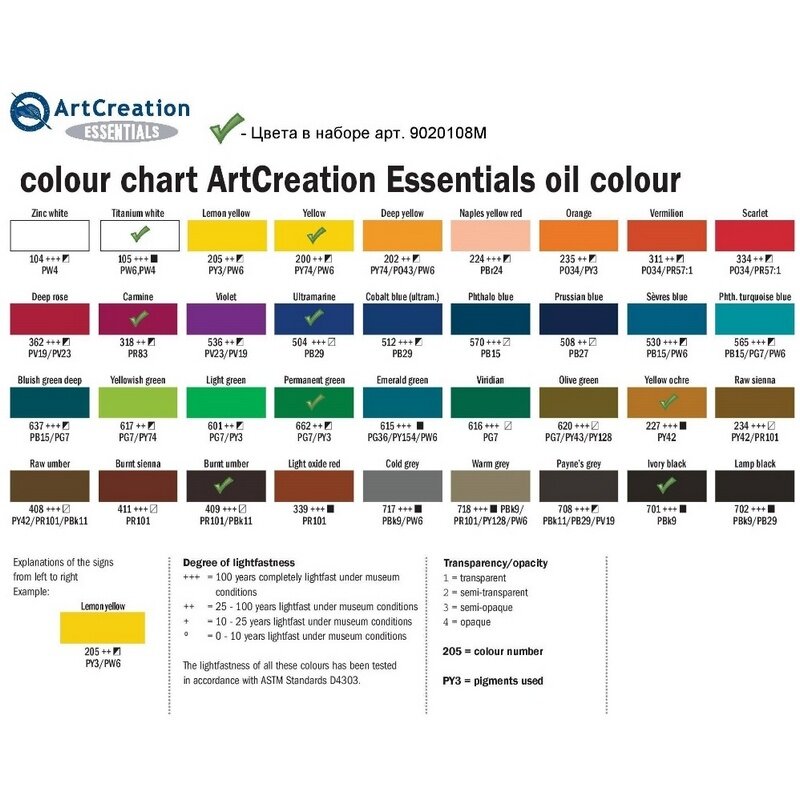 Масляные краски Art Creation изготовлены на основе растительных масел и пигментах (производство: Нидерланды). Большая часть цветов серии обладает максимальным уровнем светостойкости, не уступая в этом профессиональным масляным краскам.