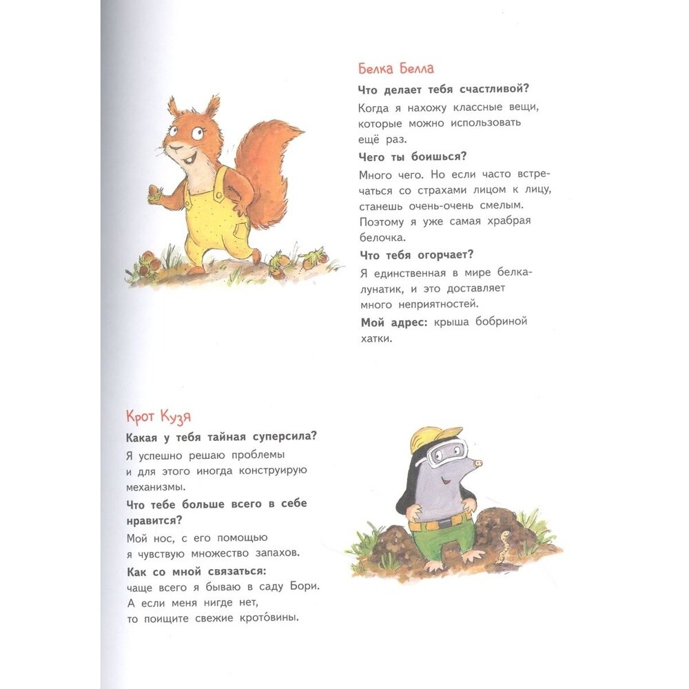Мне еще очень понравился первый разворот под названием «Из альбома друзей бобра Бори». Тут нарисованы 4 основных персонажа: бобер Боря, утка Уля, белка Белла и крот Кузя. И каждому задается несколько любопытных вопросов. Вот некоторые из них:
