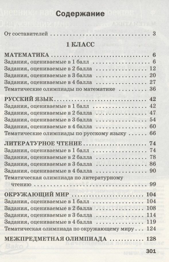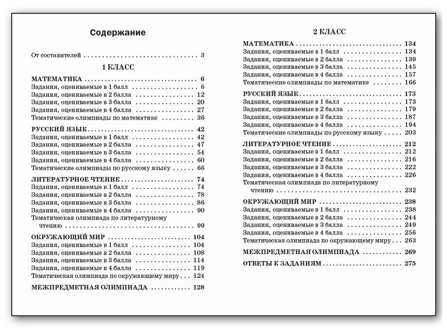 Книга очень занимательная. Задания поделены на 1 и 2 класс и на предметы. Есть задания по математике, русскому языку, литературному чтению и окружающему миру. Удобно, что все задания внутри предмета поделены на уровни сложности (от 1балла до 4-х), в конце каждого предмета имеются олимпиадные задания по этому предмету. Также в конце каждого класса есть задания по межпредметной олимпиаде. В конце книги представлены ответы к заданиям.