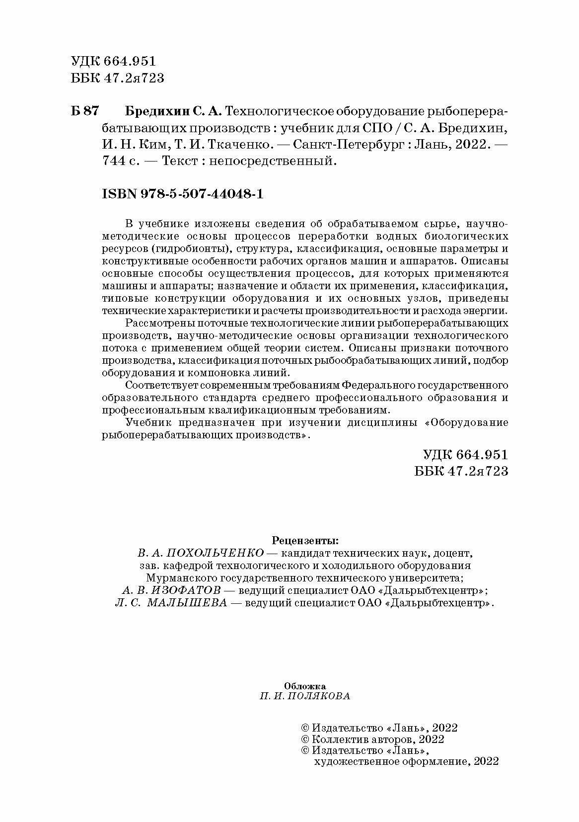 Технологическое оборудование рыбоперерабатывающих производств Учебник (Бредихин Сергей Алексеевич, Ким Игорь Николаевич (соавтор), Ткаченко Татьяна Ивановна (соавтор)); Лань, 2022