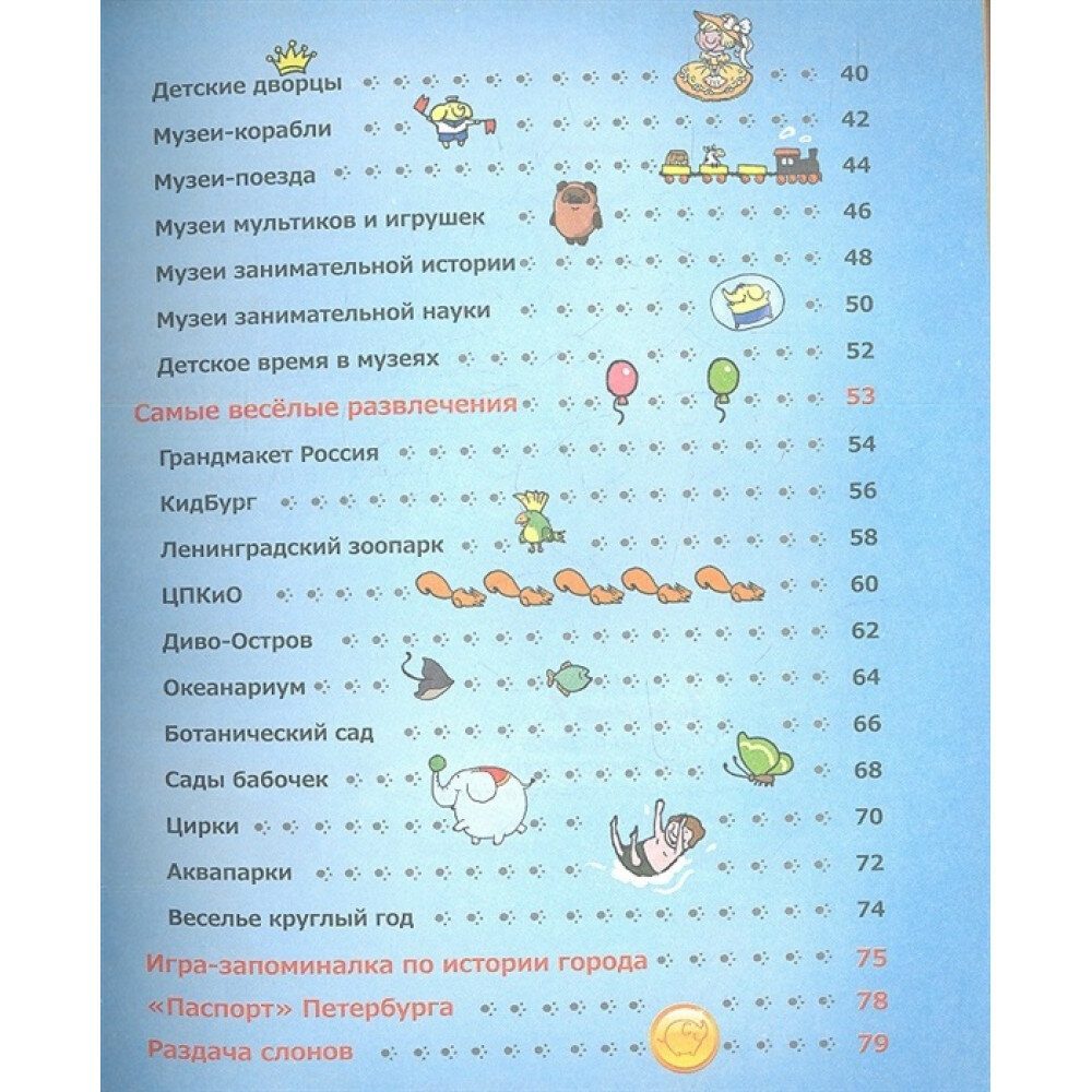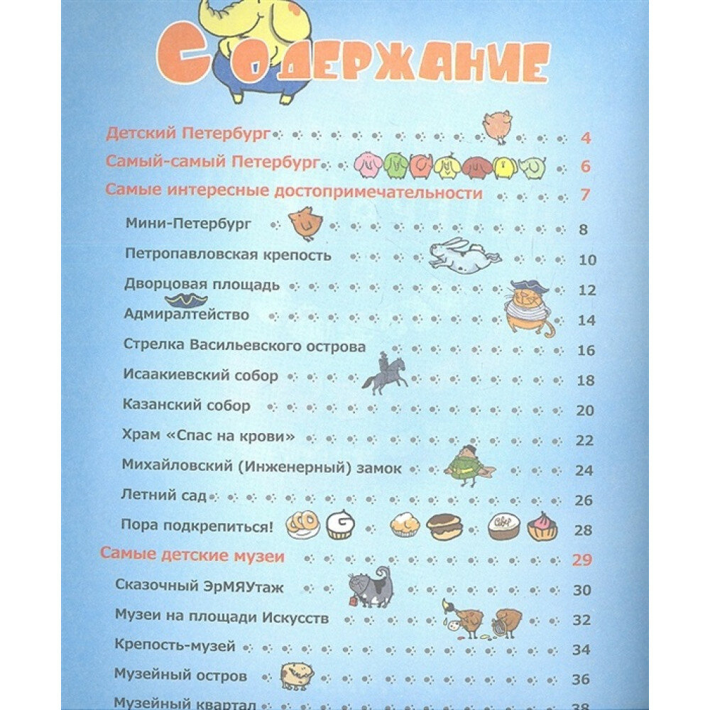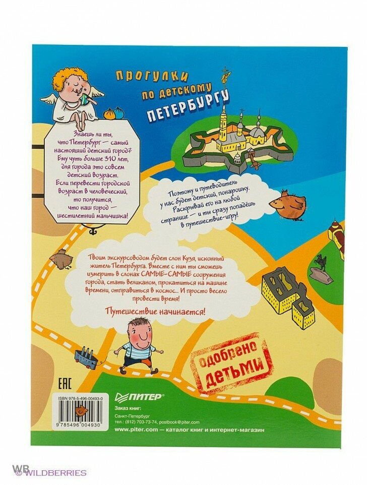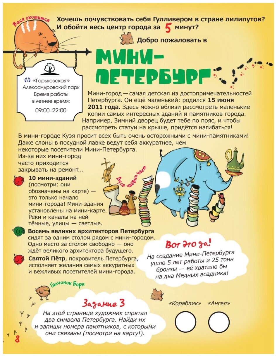 Знаешь ли ты, что Петербург - самый настоящий детский город? Ему всего 309 лет, для города это совсем детский возраст. Если перевести городской возраст в человеческий, то получится, что наш город - шестилетний мальчишка! .Поэтому и путеводитель у нас будет детский, понарошку. Раскрывай его на любой странице - и ты сразу попадешь в путешествие-игру! .Твоим экскурсоводом будет слон Кузя, исконный житель Петербурга. Вместе с ним ты сможешь измерить в слонах самые-самые сооружения города, стать великаном, прокатиться на машине времени, отправиться в космос И просто весело провести время! .Путешествие начинается!