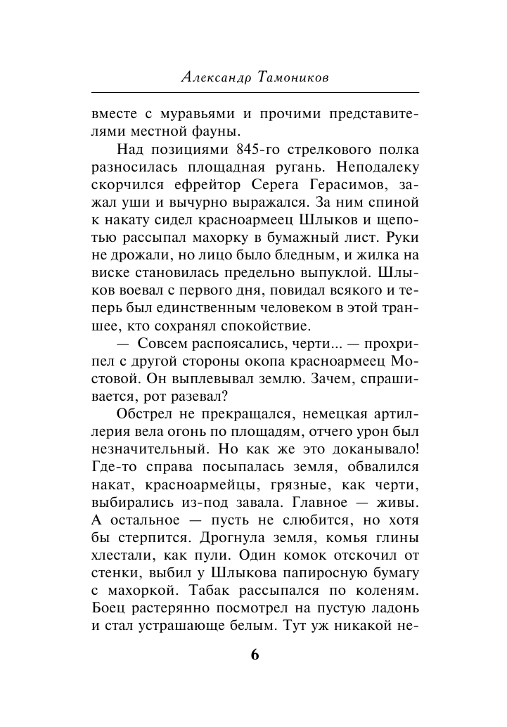 Очередная книга А. Тамоникова о военных разведчиках образца 1941 года. На этот раз действия развиваются в конце августа 41-го. Ельнинская операция. На страницах мы встречаемся с уже нами знакомым командиром взвода разведчиков лейтенантом Шубиным (помню что уже про него читал, но там действия развивались попозже, так что видно порядок чтения я перепутал). В этом романе у ГГ будет 2 задания и одно труднее другого: 1.- взять "языка", а до этого ни у кого не получалось это сделать в их полку, только личный состав потеряли зазря. 2.-уничтожить оставленный Красной Армией склад с боеприпасами, который остался на оставленной территории. Вот про второе задание и пойдет основное повествование. Эта книга из этой серии понравилась именно отсутствием пафоса, были конечно моменты от которых глаза закатывались в потолок сами собой, но немного и если подумать, то такое в принципе могло случиться на самом деле.