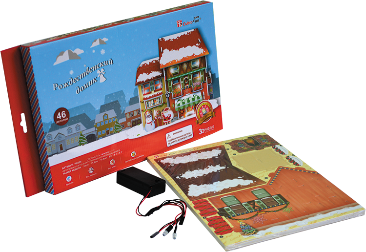 3D-пазл с подсветкой Рождественский магазин позволит из 46 элементов построить небольшое трехэтажное здание, выполненное в архитектурном стиле центральной Европы. Модель домика обладает множеством деталей, делающих его внешний вид намного реалистичней. Внизу стоят фигурки Санты и снеговика, а крыша домика присыпана снегом.Домик выглядит намного эффектней в темноте, так как обладает подсветкой. Трехмерная конструкция складывается по инструкции из деталей, выполненных из плотного спрессованного картона. Набор подойдет для развития навыков конструирования, логического мышления, а также внимания и терпения детям от 8 лет и имеет 4 уровень сложности.