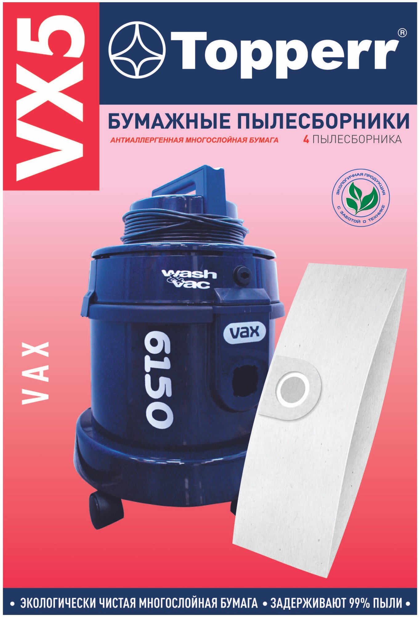 Бумажные пылесборники VX 5 для пылесосов VAX изготовлены из экологически чистой двухслойной бумаги, соответствующей европейскому стандарту качества, задерживают 99% пыли, продлевая срок службы пылесоса, сохраняют чистоту воздуха и устраняют вредные бактерии.