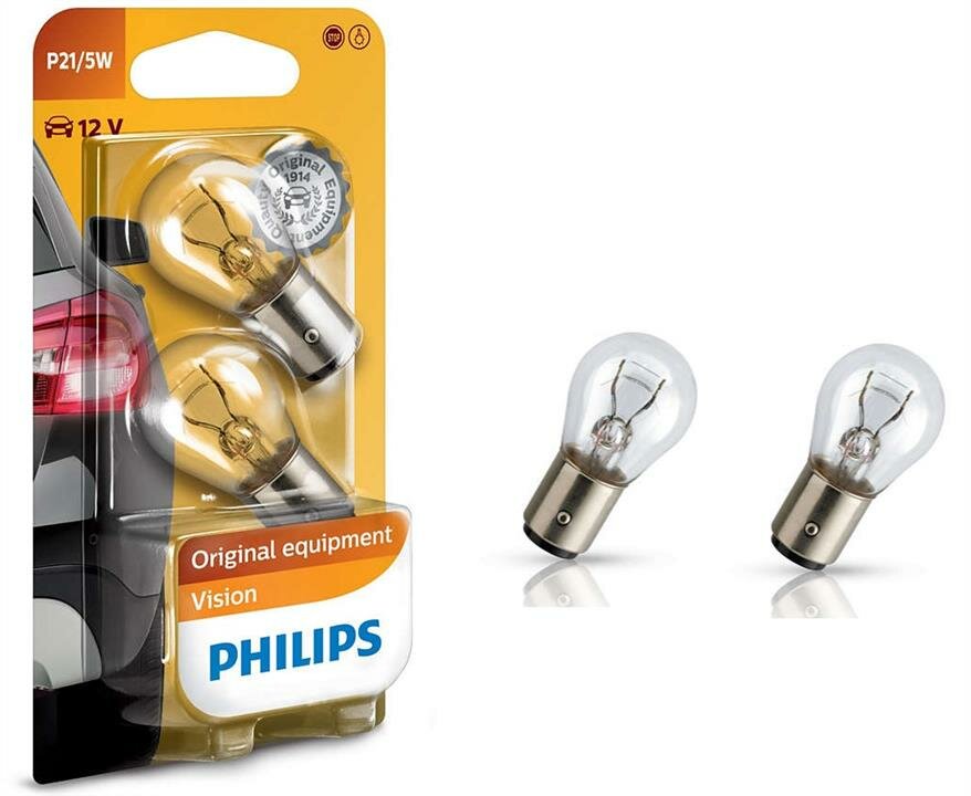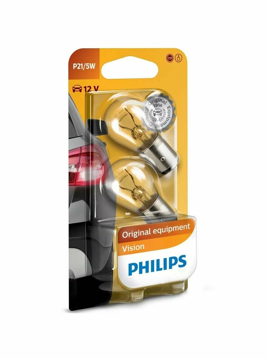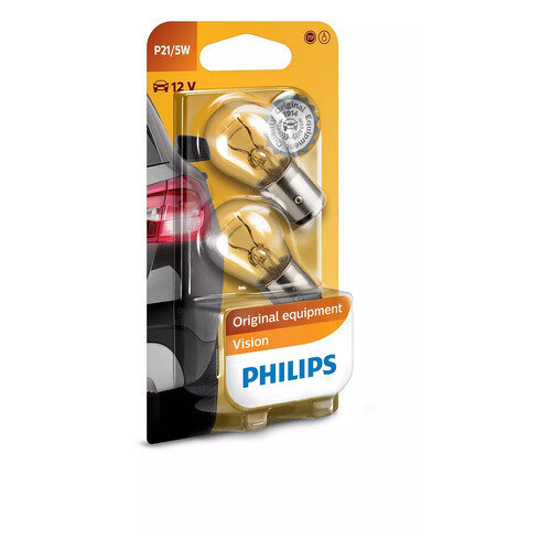 Автолампа блистер, 2шт. PHILIPS P21/5W BAY15d 12V/ 1/10 12499B2 - источник освещения для установки на автомобиль в качестве ближнего и дальнего света фар. Модель отличается надежной и эффективной светоотдачей. Прослужит длительное время. Лампа значительно повышает уровень безопасности при передвижении на авто в темное время суток.