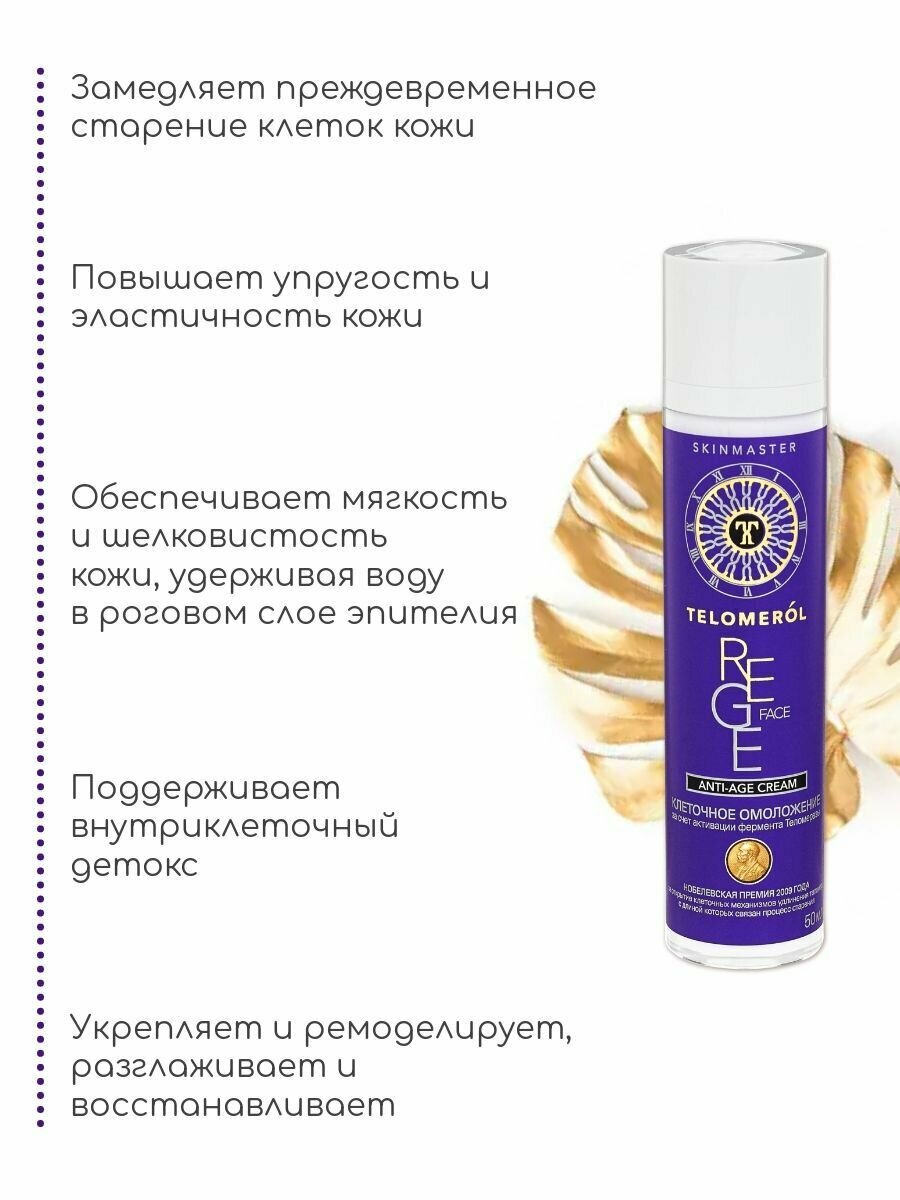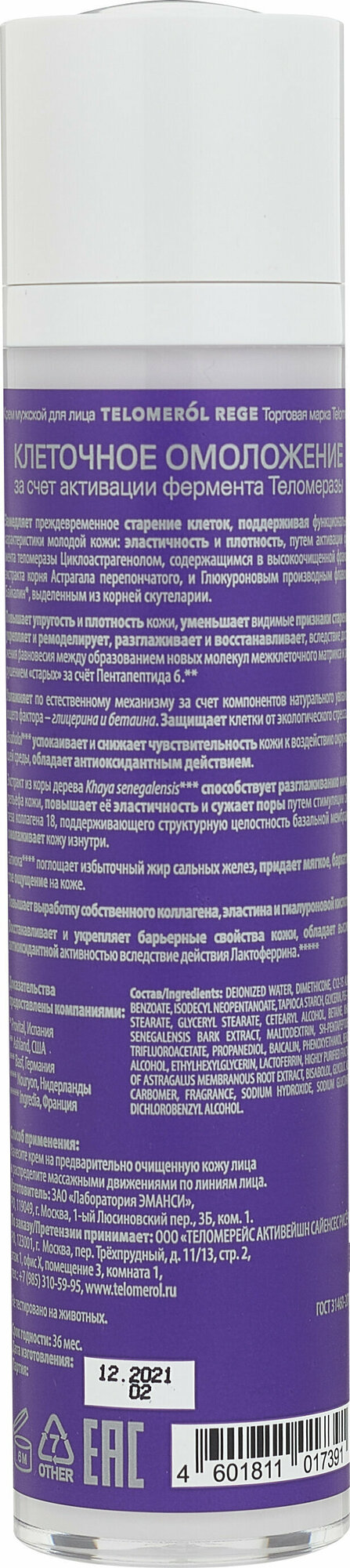 Telomerol Rege мужской крем для лица:- Замедляет преждевременное старение клеток, поддерживая функциональные характеристики молодой кожи: эластичность и плотность- Успокаивает и снижает чувствительность кожи к воздействию окружающей среды, обладает антиоксидантным действием- Стимулирует образование нового коллагена и гиалуроновой кислоты в коже- Активирует синтез собственной гиалуроновой кислоты и восстанавливает водный баланс- Стимулирует клеточную регенерацию