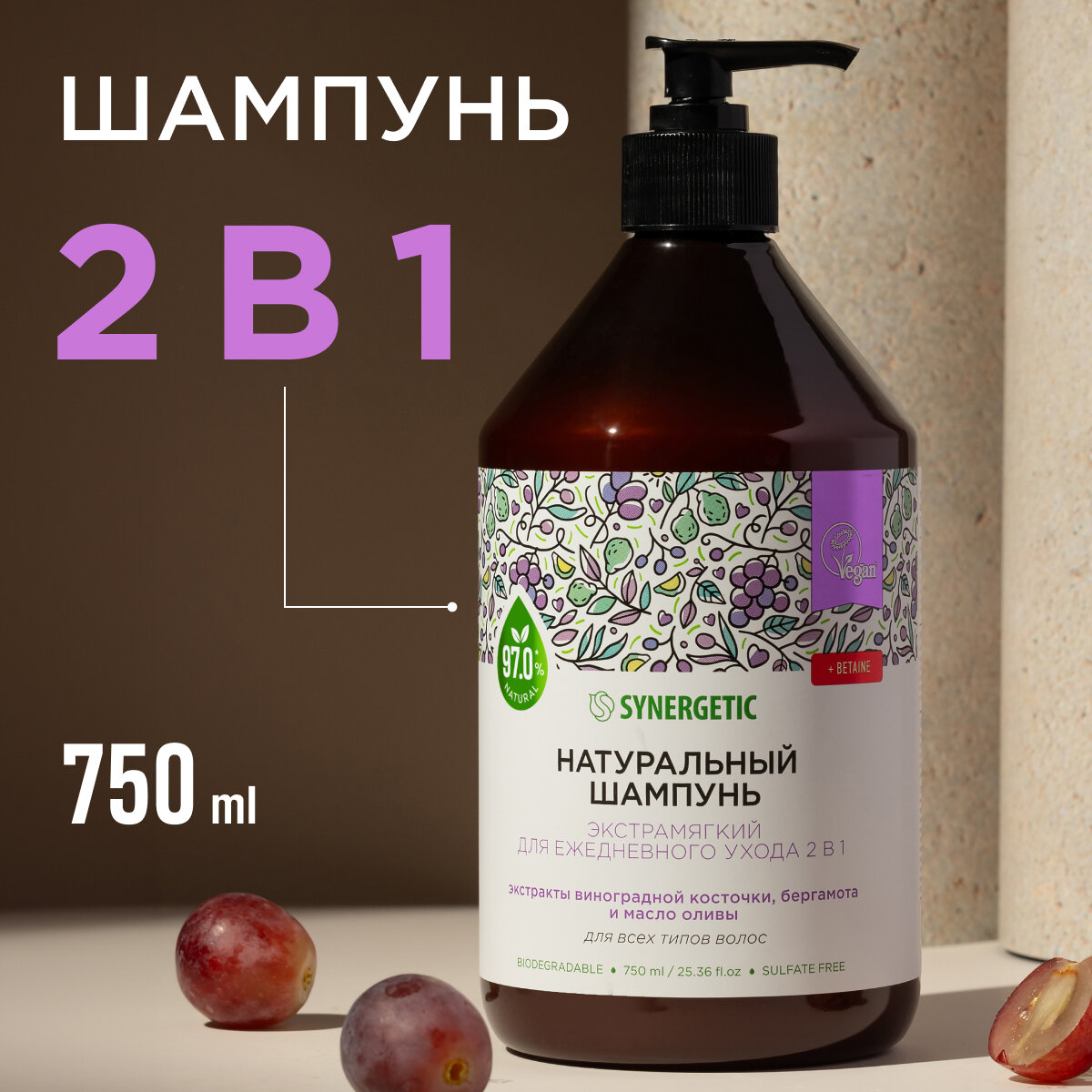 Бессульфатный шампунь Synergetic Экстрамягкий для ежедневного ухода 2 в 1 — эффективное средство для очищения кожи головы и всех типов волос — более чем на 98% состоит из натуральных компонентов.