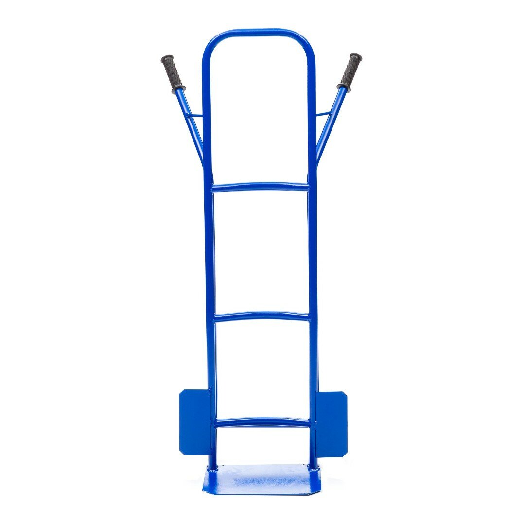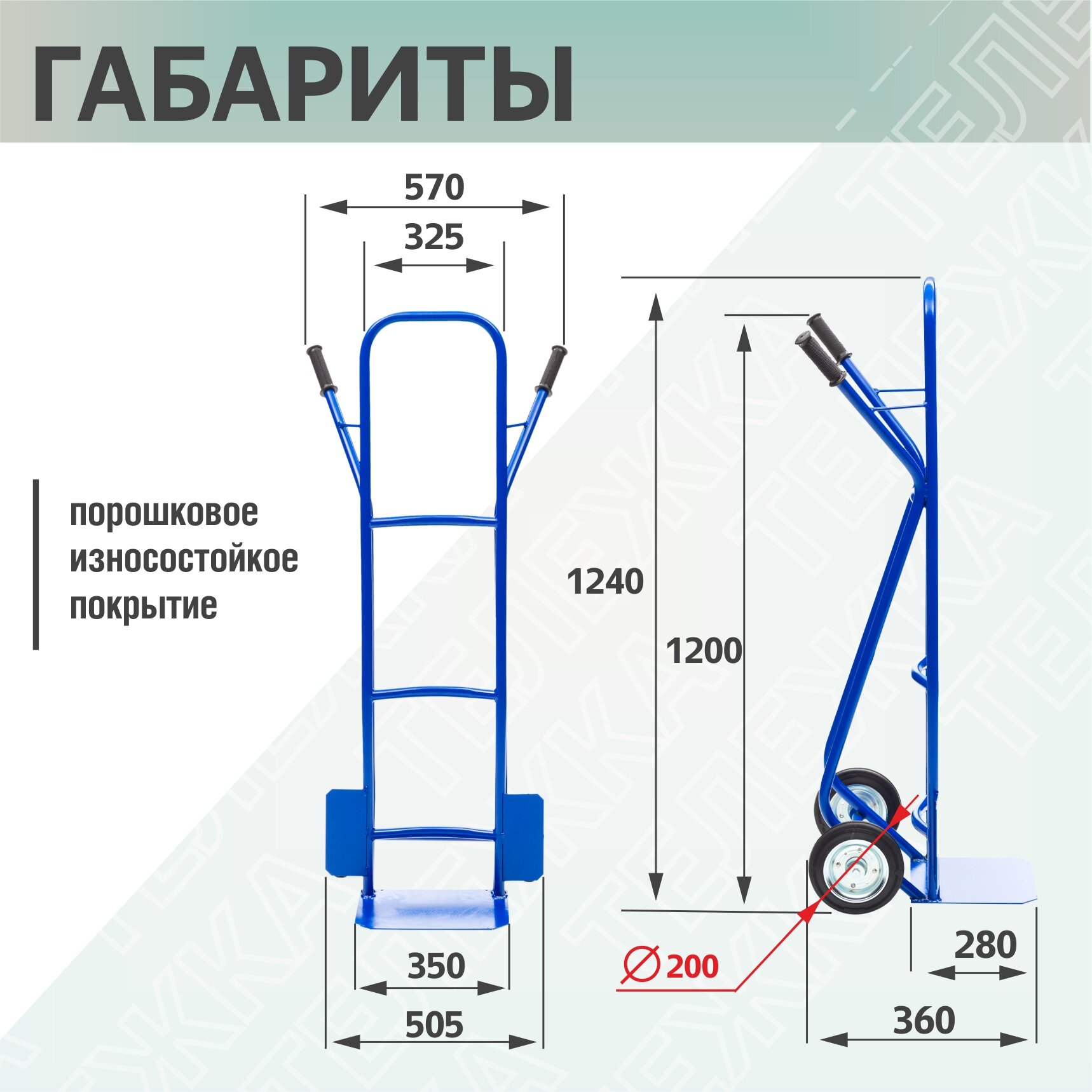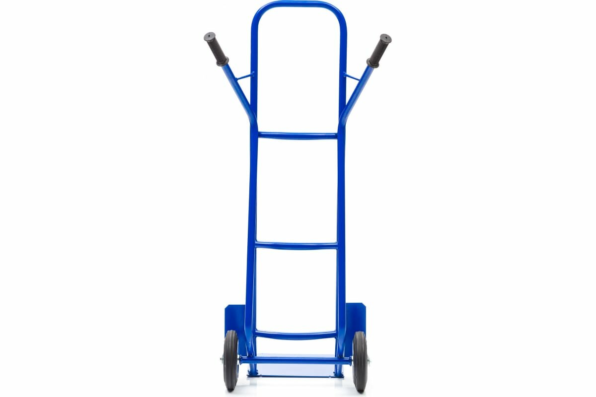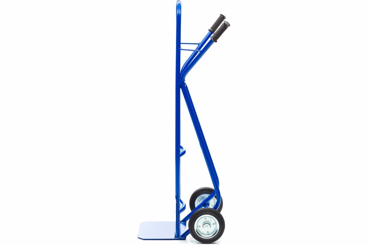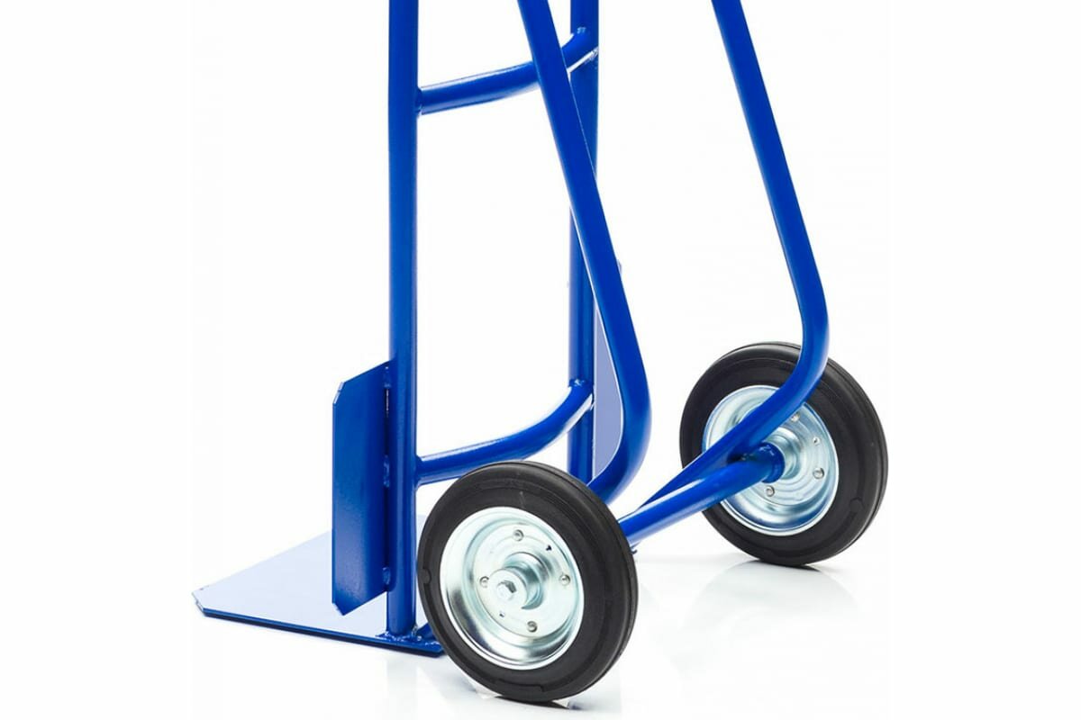 Двухколесная тележка имеет высокопрочную металлическую конструкцию и покрывается износостойкой краской синего цвета. Размер нижней платформы составляет 320x210 мм. На площадку легко устанавливаются не только маленькие картонные короба, но и крупногабаритная тара. К примеру, коробки с ЖК-телевизорами или электроплитами.
