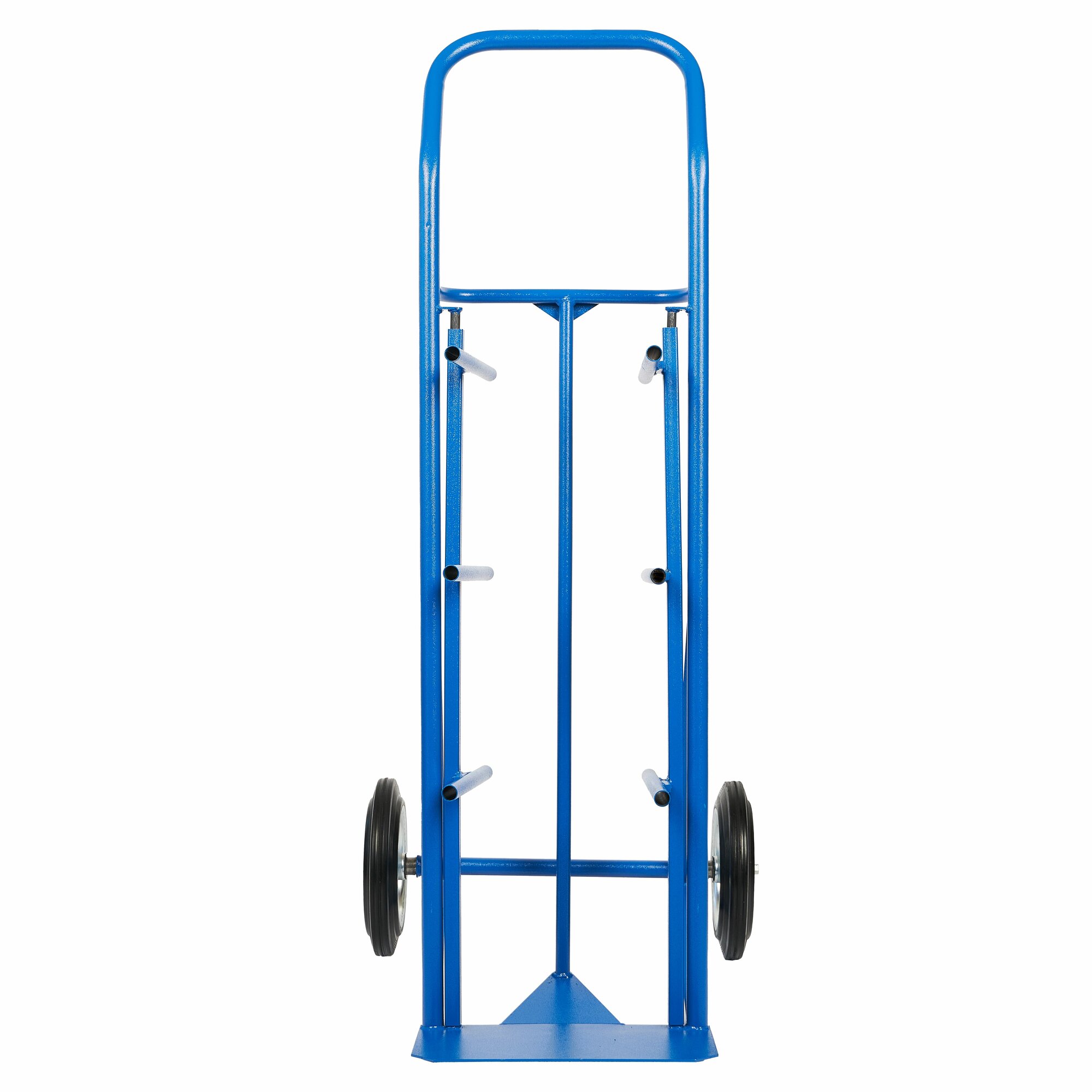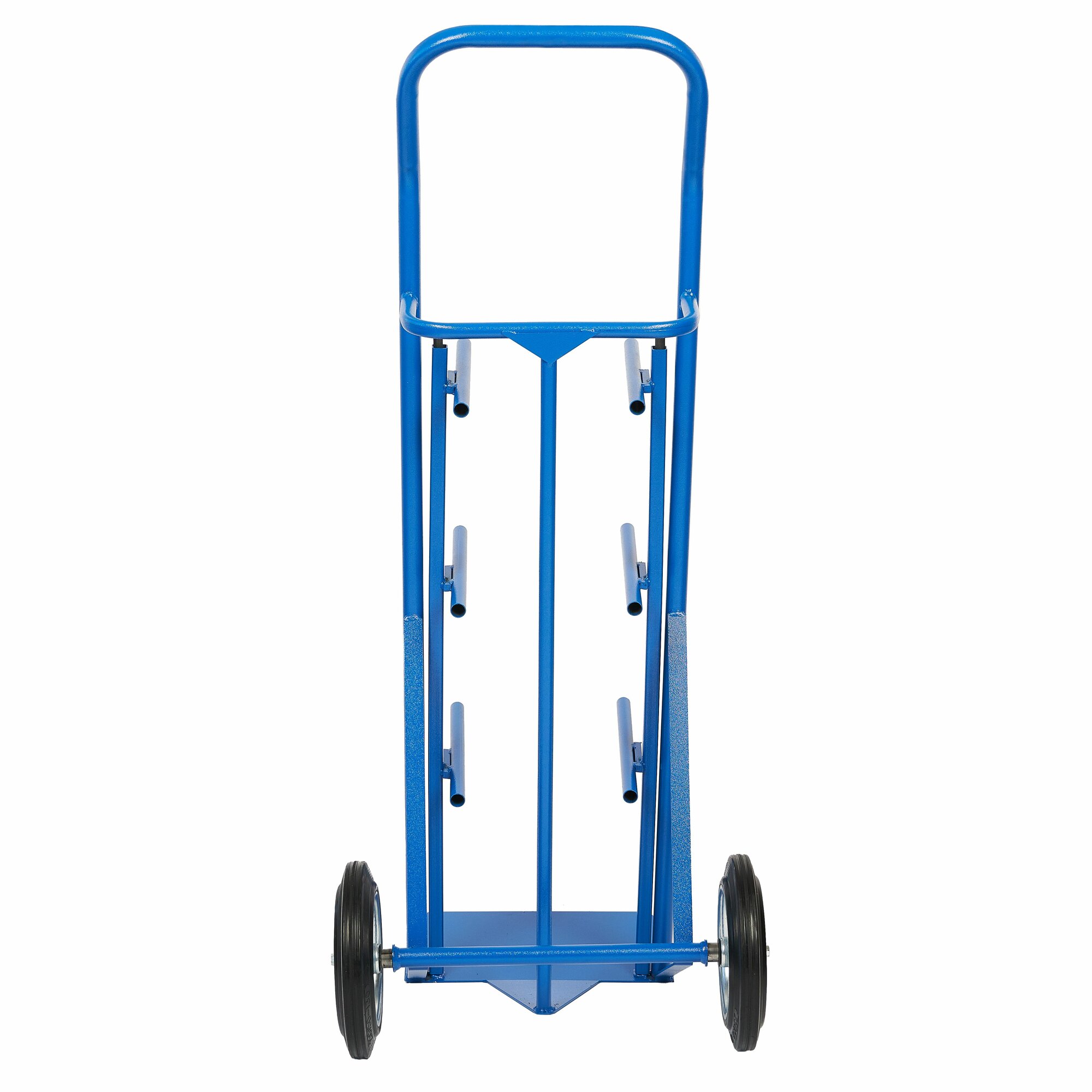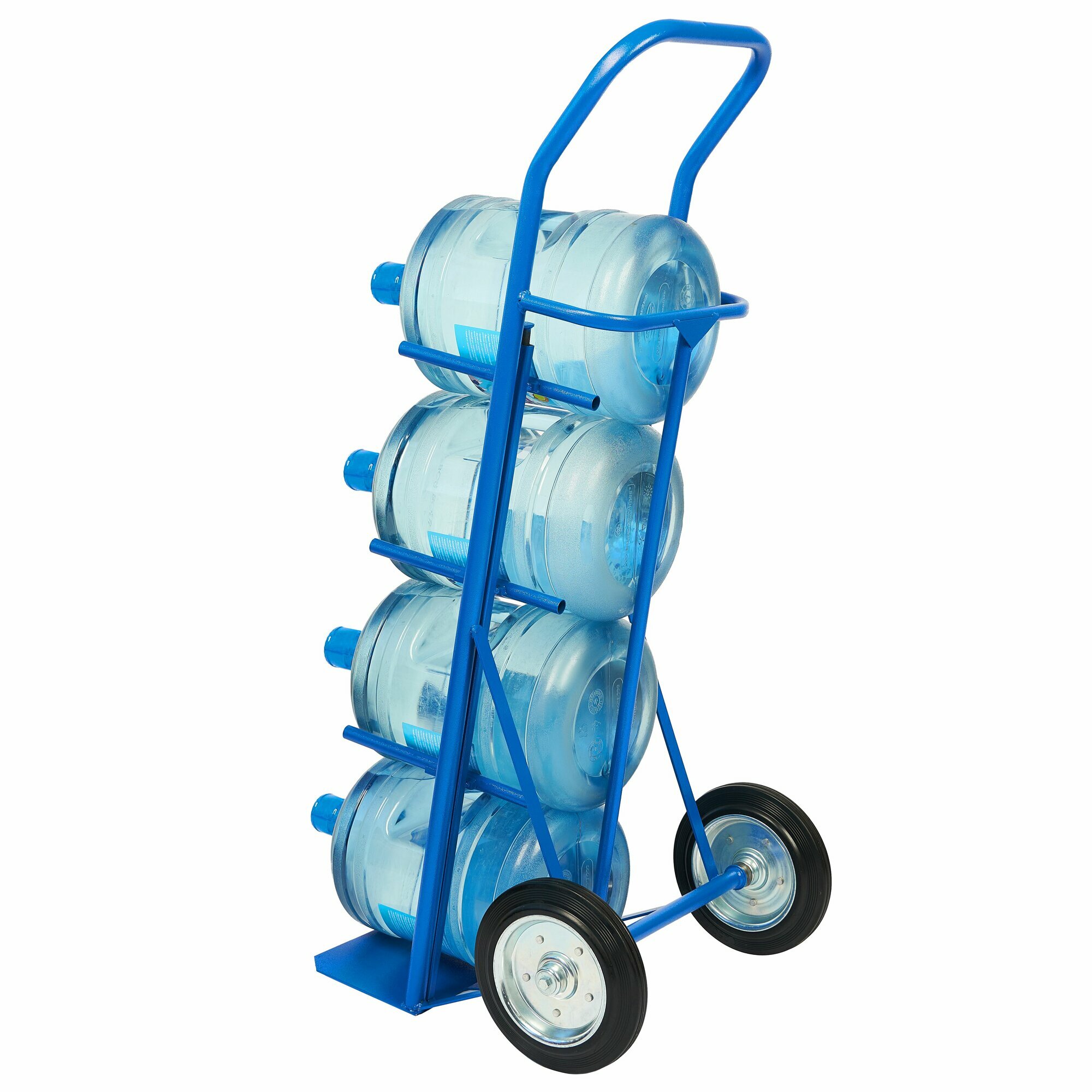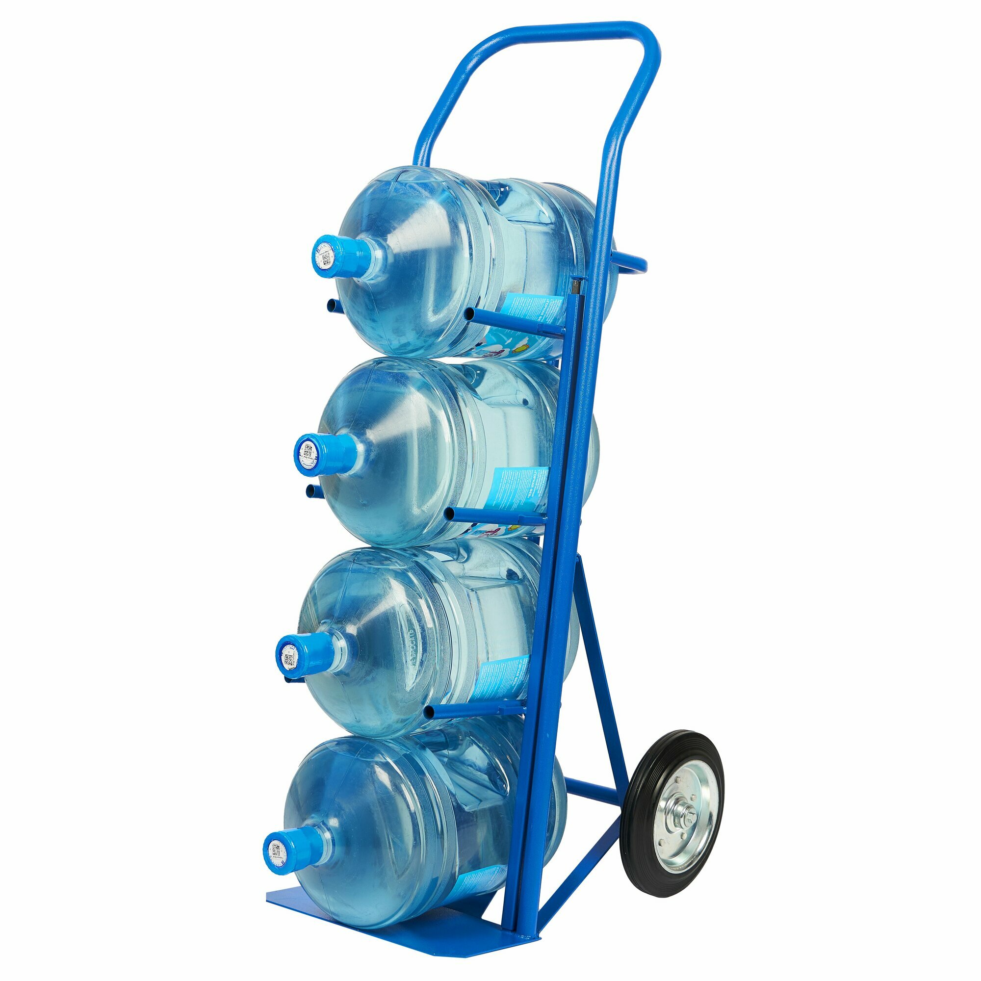 Тележка удобная модель для одновременной перевозки четырех баллонов (19 л.) с водой. На каркасе тележки установлены ряды перекладин и задняя планка для надежной фиксации бутылей параллельно земле (под небольшим наклоном). Баллоны кладутся друг на друга как на стеллаже, что позволяет вытаскивать каждый из них отдельно.