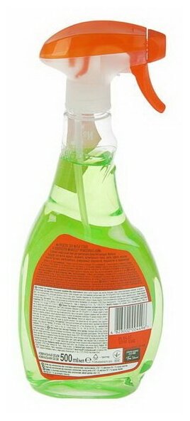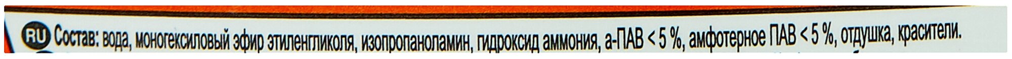 Средство для стекол Mr Muscle с нашатырным спиртом 500 млНазначение Подходит для мытья оконного, витринного, автомобильного стекла, зеркал, кафеля, внешних панелей электробытовых приборов, хромированных поверхностей, поверхностей из нержавеющей стали. С нашатырным спиртом. Способ применения 1. Поверните носик распылителя из положения «STOP» в положение 2. Нанесите средство на поверхность, нажимая на курок. 3. Насухо протрите мягкой не ворсистой тканью или бумагой. 4. По окончании применения поверните носик распылителя в положение «STOP». Не рекомендуется использовать для очистки полированных и лакированных деревянных поверхностей. При необходимости использования на таких поверхностях или других, не перечисленных выше, предварительно протестируйте средство на незаметном участке. Перед очисткой электроприборов отключайте их от сети. Меры предосторожности Беречь от детей. Не вдыхать пары средства. Использовать только в хорошо проветриваемых помещениях. Не смешивать с другими чистящими средствами. Избегать продолжительного контакта с кожей и попадания в глаза. После применения тщательно вымыть руки. СоставВода, моногексиловый эфир этиленгликоля, изопропаноламин, гидроксид аммония, а-ПАВ < 5%, амфотерное ПАВ < 5%, отдушка, красители. Неприменимо. Условия хранения Хранить при температуре от −5 °С до + 25 °С в сухом, недоступном для детей и домашних животных месте, отдельно от пищевых продуктов. Срок годности 2 года с даты изготовления при соблюдении условий хранения.