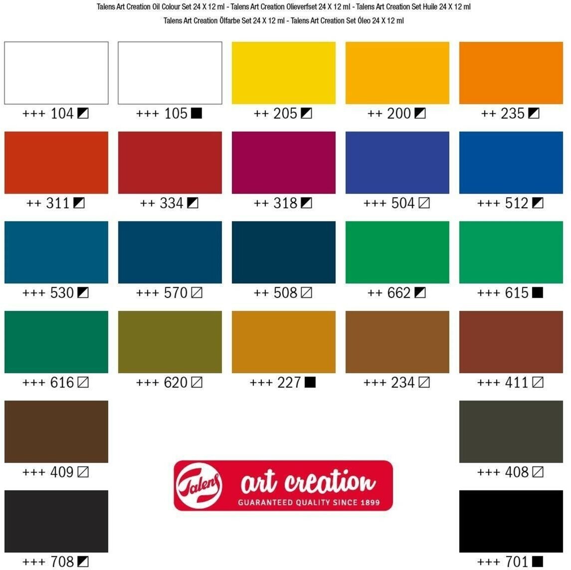 Масляные краски Art Creation изготовлены на основе растительных масел и пигментах (производство: Нидерланды). Большая часть цветов серии обладает максимальным уровнем светостойкости, не уступая в этом профессиональным масляным краскам.