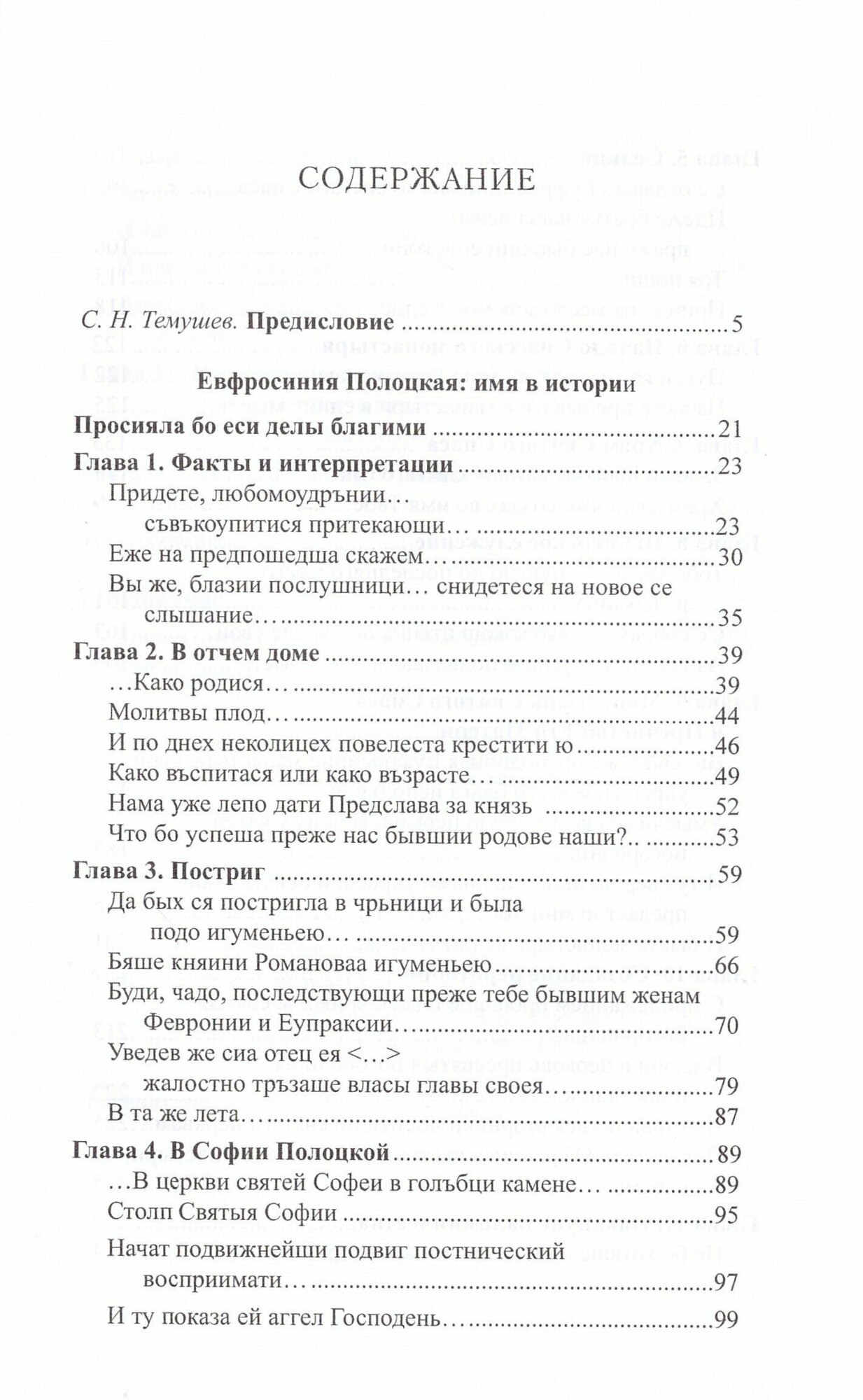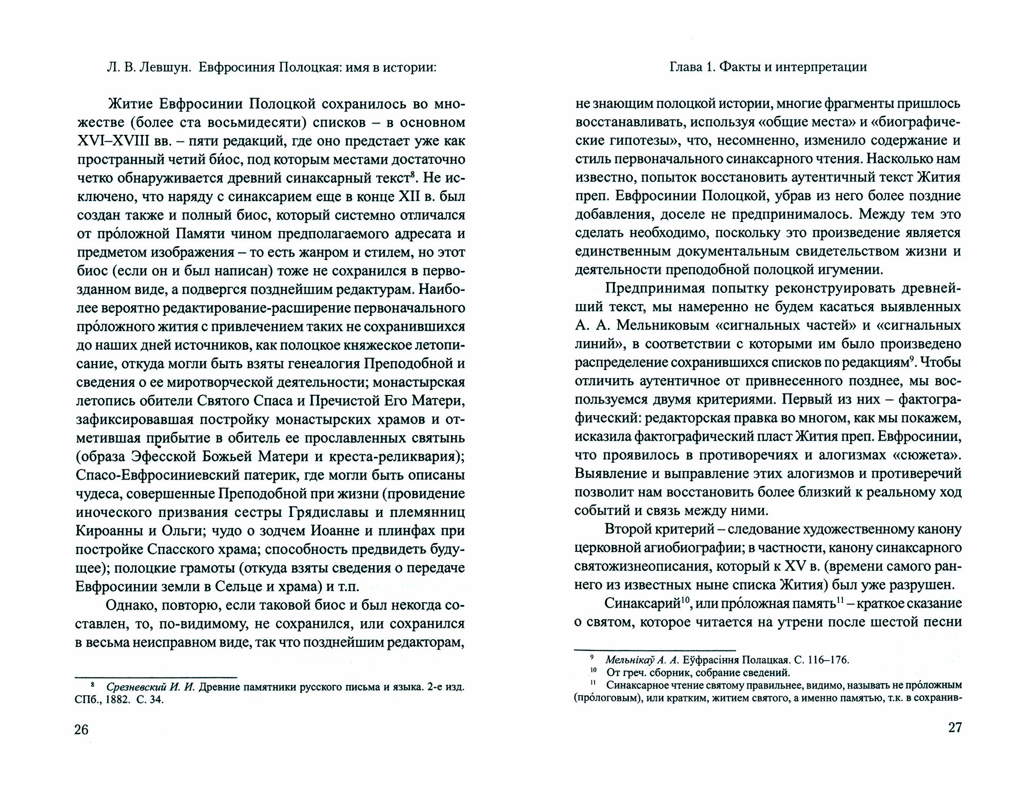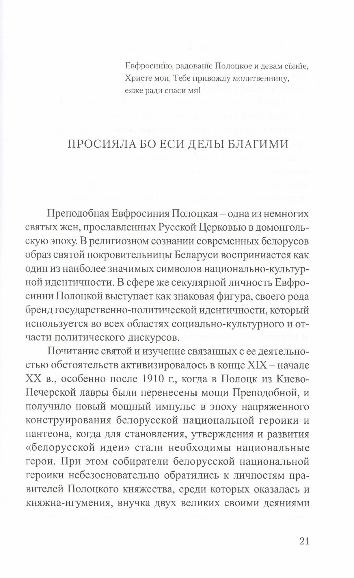 В книге предпринята попытка научно интерпретировать такие отраженные в Житии преп. Евфросинии Полоцкой факты, как: место, время и обстоятельства рождения Предславы; чудо, случившееся при монашеском постриге Евфросинии; причины прихода ее в Софийский собор Полоцка и характер деятельности во время пребывания там; обстоятельства ухода Преподобной в Сельце; статус Сельца в метохии Св. Софии Полоцкой; время, причины и обстоятельства возведения Спасской церкви в Сельце; тип основанного Преподобной монастыря и количество насельниц в нем в бытность Преподобной; хронологию паломничества святой полоцкой игуменьи в Иерусалим, дату ее кончины и, наконец, время канонизации полоцкой игуменьи и перенесения ее святых мощей из Святой Земли в Киево-Печерский монастырь и нек. др. Книга будет интересна филологам, историкам, культуроло-