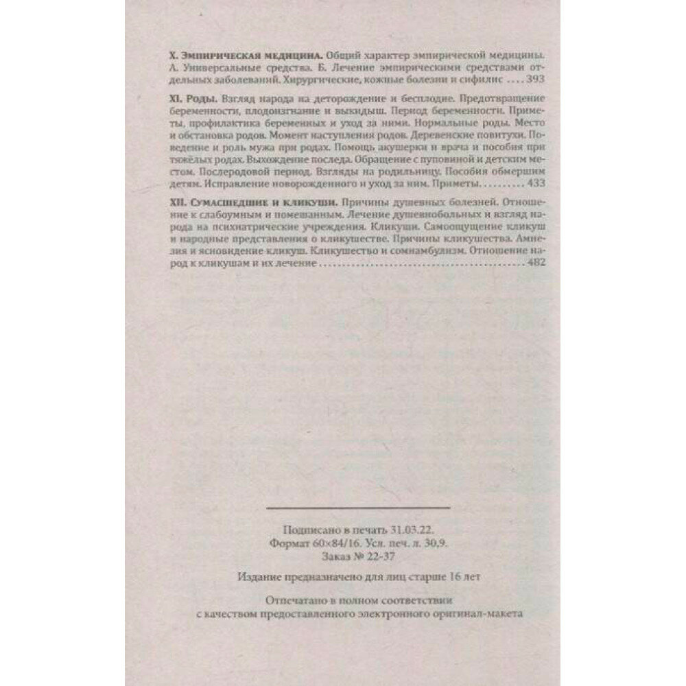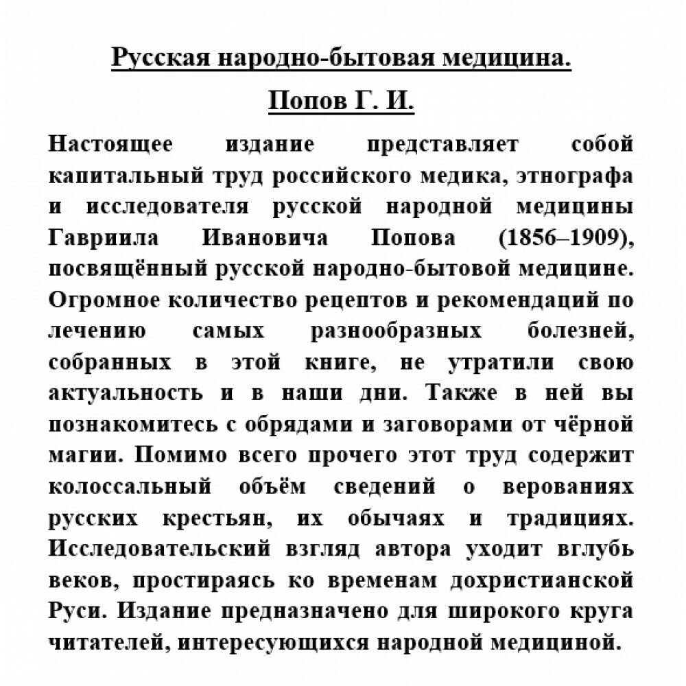 Настоящее издание представляет собой капитальный труд российского медика, этнографа и исследователя русской народной медицины Гавриила Ивановича Попова (1856–1909), посвящённый русской народно-бытовой медицине. Огромное количество рецептов и рекомендаций по лечению самых разнообразных болезней, собранных в этой книге, не утратили свою актуальность и в наши дни. Также в ней вы познакомитесь с обрядами и заговорами от чёрной магии. Помимо всего прочего этот труд содержит колоссальный объём сведений о верованиях русских крестьян, их обычаях и традициях. Исследовательский взгляд автора уходит вглубь веков, простираясь ко временам дохристианской Руси. Издание предназначено для широкого круга читателей, интересующихся народной медициной.