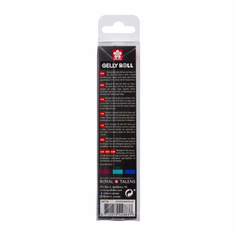 В набор входят 3 гелевые ручки Sakura Gelly Roll Moonlight 06 с толщиной линии 0.3 мм.