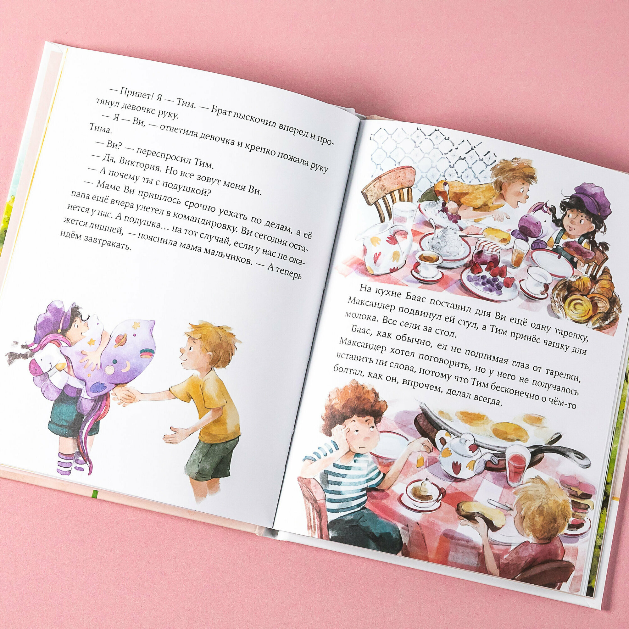 Если вдруг рядом с вами поселилась озорная кудрявая соседка, значит — приключениям быть!Однажды Максандер увидел, как в соседний дом переезжает новая семья, а с ними девочка, явно настолько дерзкая, что Максандер никак не мог выкинуть её из головы. И вдруг на следующий день она появилась на пороге их дома, потому что её маме срочно пришлось уехать по делам! Так Максандер, Тим и Баас узнали, что Ви вовсе и не дерзкая, а даже застенчивая, а ещё любит фиолетовый цвет, играть в пиратов и знает, где в их городке спрятан дом на дереве. Братья и их новая подруга решают срочно поехать к нему, ведь это место явно появилось в их городке не просто так — возможно, именно пираты и построили его много лет назад...