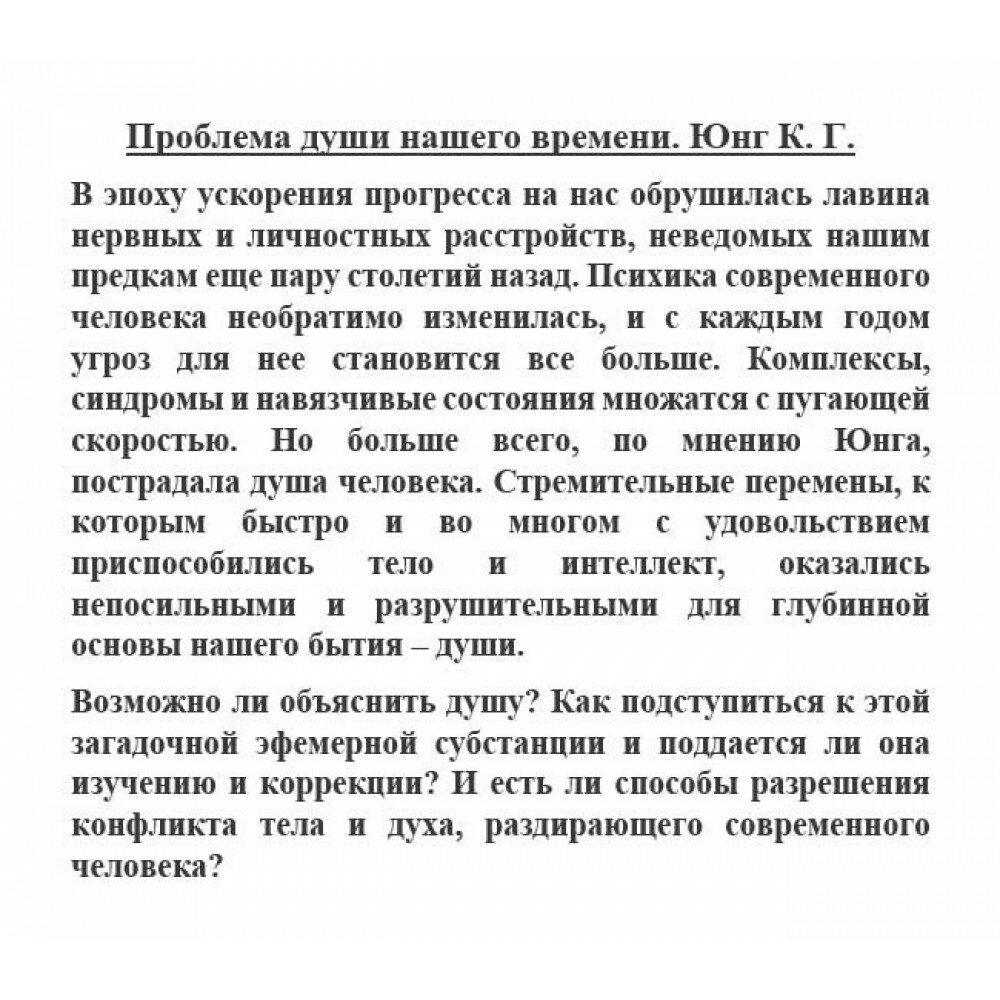 По мере чтения книги и адаптации к тексту будет подступать усталость и от былого воодушевления к последней главе(которая носит название книги) останется не так уж и много, впрочем, это не меняет приятное впечатление от работы Густава Юнга в целом. Из примечательного: глава в которой описывается взаимоотношение взглядов Юнга, Фрейда и Адлера, после прочтения работ этой тройки, каждая из которых описывают разные доктрины, безусловно, интересно узнать, как они взаимодействуют, он также уделяет много внимания психотерапии его времени и ее шансам/перспективам дальнейшего развития, сама книга носит психо-философский характер, Юнг считал, что философия должна находить свое место в психологии и выделял ее отсутствие в работах, Фрейда и Адлера, как недостаток. Проблема души его времени имеет схожие с работой Ницше черты, проблема человечества, которое мнит свое существование заключительным/конечным и этим рационализирует отсутствие у себя стремления к углублению знаний.