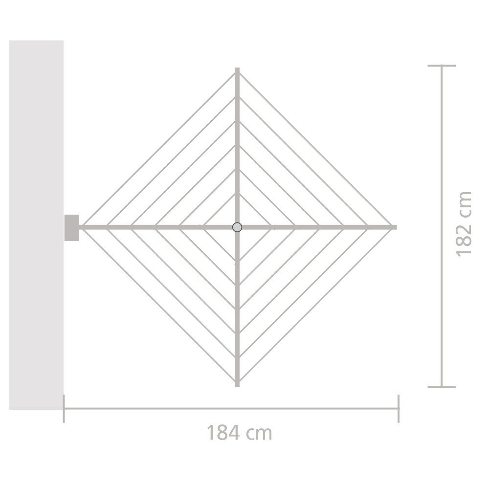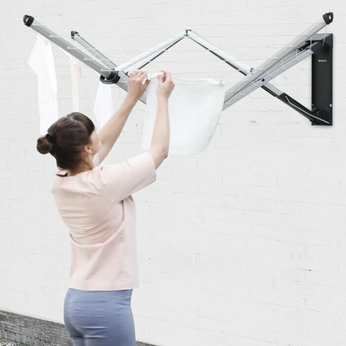 Brabantia Wallfix - настенная сушилка с рабочей поверхностью до 24м. - Подходит для крупных предметов белья - внешние линии 120 см, нагрузка 20 кг, до 24 м навески. - Также идеально подходит для маленьких площадей. Сушилка компактно складывается и раскрывается одним движением руки. - Ветрозащитная и неподвластная погодным условиям прочная конструкция изготовлена из коррозионностойких материалов. - Проста в установке, необходимо следовать пошаговой инструкции (фурнитура для крепления к стене в комплекте).