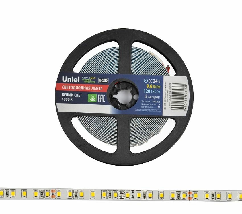 | Артикул | ULS-2835-120LED/m-8mm-IP20-DC24V-9,6W/m-5M-4000K |