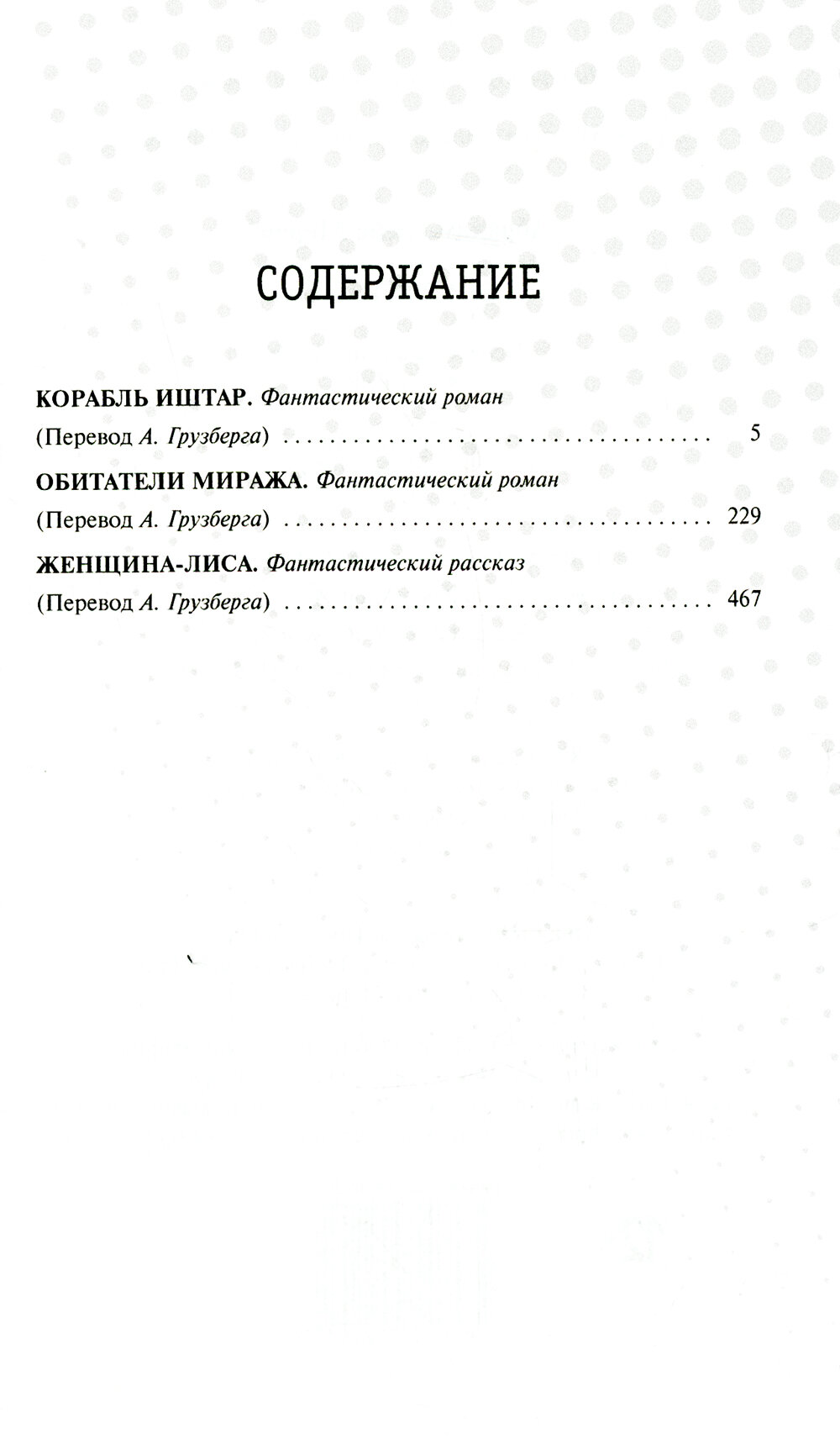 В очередной том вошли романы "Корабль Иштар" (1924), а также "Обитатели миража" (1932), а также рассказ "Женщина-лиса" (1946).