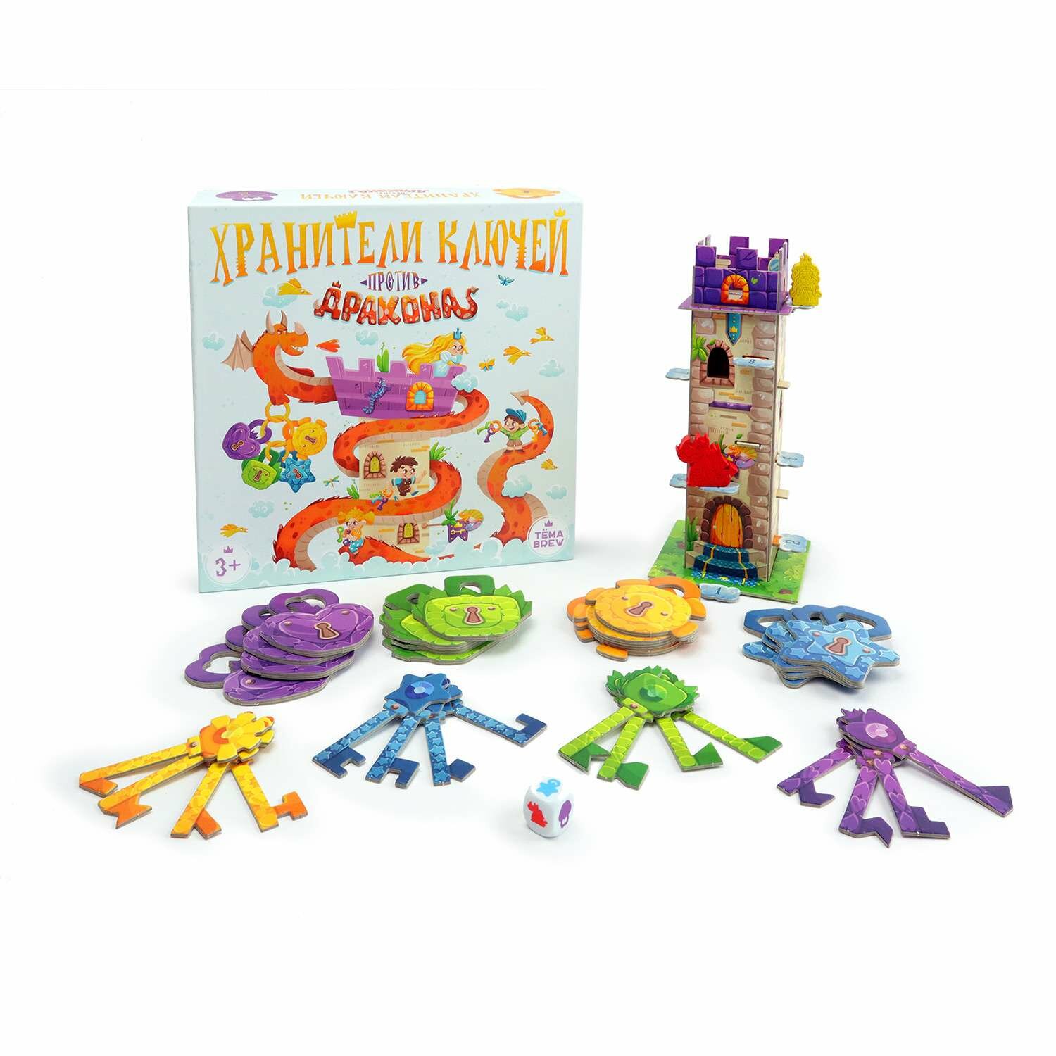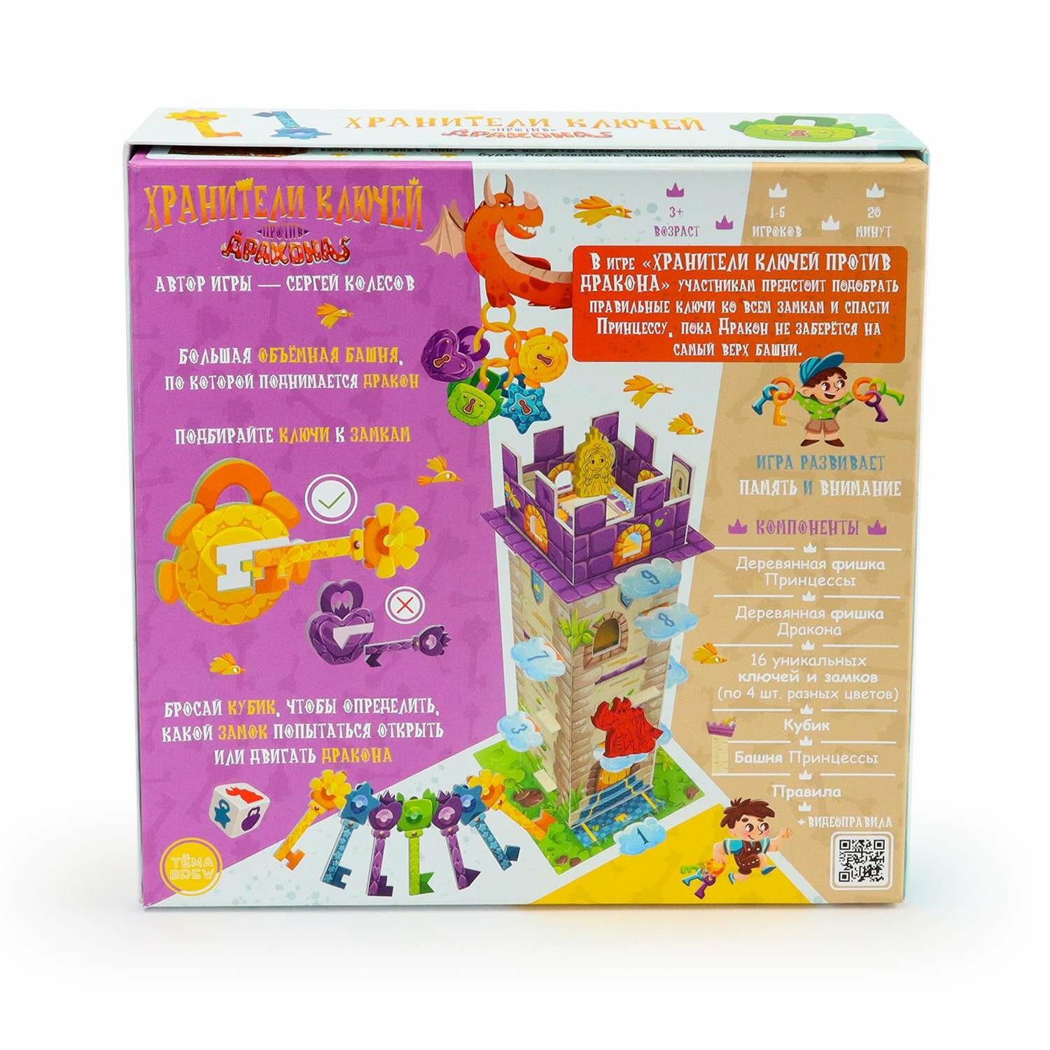 В игре Хранители ключей против Дракона участникам предстоит подобрать правильные ключи ко всем замкам и спасти Принцессу, пока Дракон не заберётся на самый верх башни. Правила игры очень просты: участники бросают кубик и стараются выбрать какой ключ подходит к замку выпавшего цвета. Затем переворачивают замок и проверяют подошел ли ключ. К каждому замку относится только 1 уникальный ключ, а всего их в игре 16. Замки устроены таким образом, что ключи можно вставить только с обратной стороны. Поэтому игрокам предстоит не только испытывать удачу, но и запоминать какие ключи нужны к уже опробованным замкам. В это же время грозный дракон поднимается к принцессе если на кубике выпадает нужная ему сторона. Задача игроков открыть все двери в башне и успеть к принцессе раньше грозного Дракона. Все игроки действуют сообща, выигрывают или проигрывают вместе, поэтому игра идеально подойдет самым маленьким игрокам и научит их запоминать расположения нужных компонентов и радоваться спасению принцессы всей семьей.