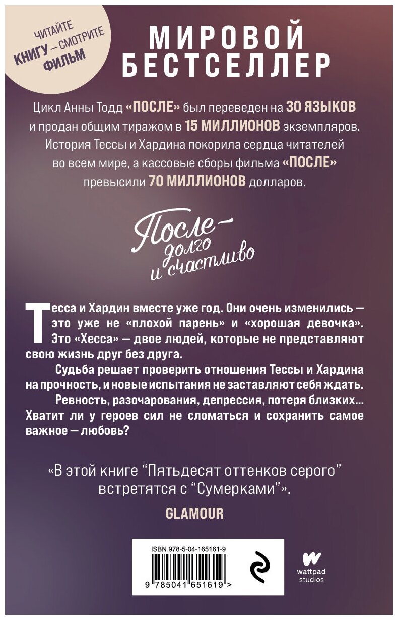 Тетралогия "После" от Анны Тодд покорила весь мир. Цикл был переведен на 30 языков и продан общим тиражом в 15 миллионов экземпляров. История Тессы и Хардина покорила сердца читателей во всем мире, а кассовые сборы фильма "ПОСЛЕ" превысили 70 миллионов долларов.