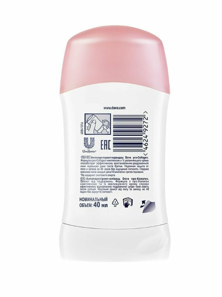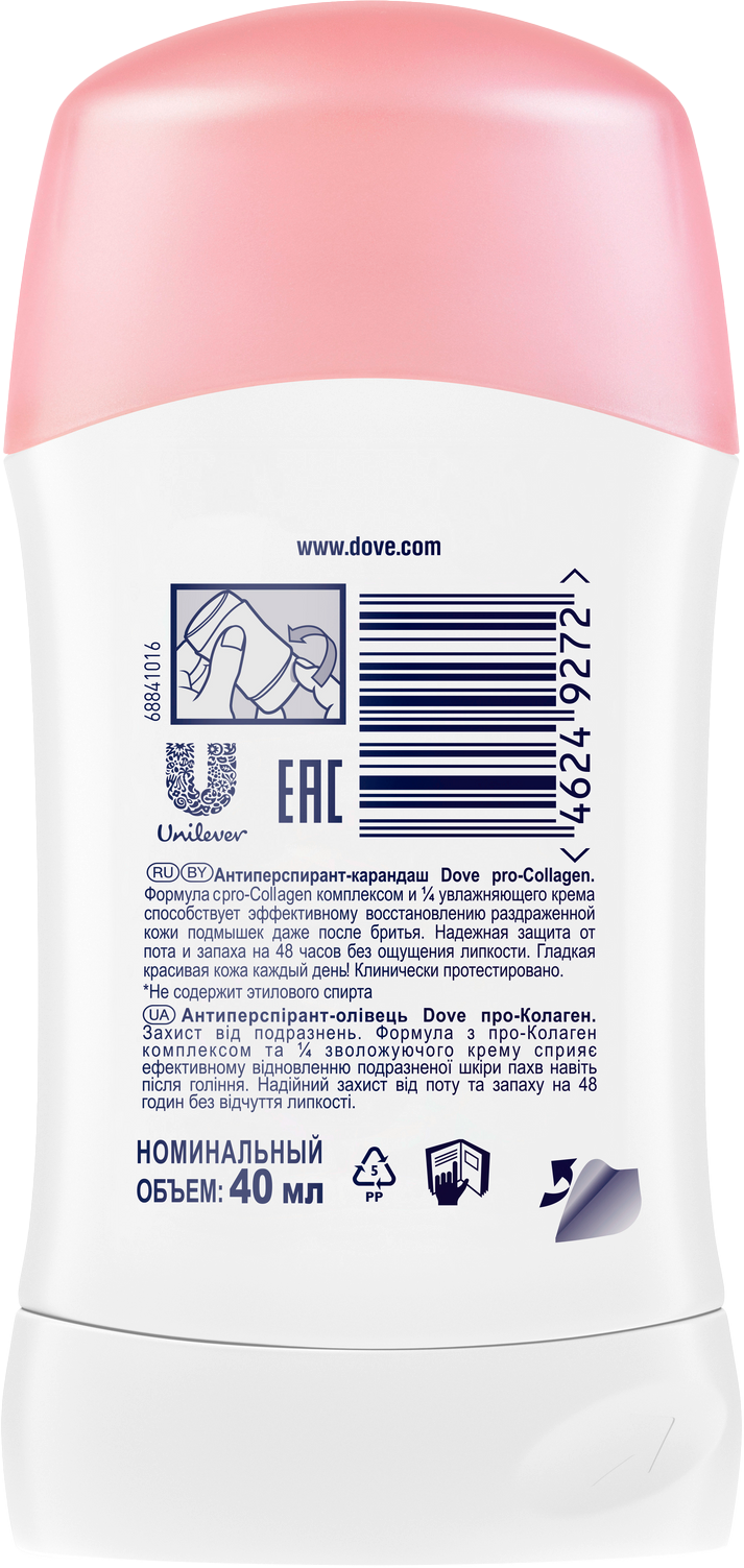 Чувствуете, что ваш дезодорант не справляется? Попробуйте новинку от Dove! Эксперты бренда знают, что чувствительная кожа подмышек нуждается в особом уходе и качественной защите. Антиперспирант-карандаш Dove Pro-Collagen обеспечивает бескомпромиссную длительную защиту от пота и запаха в течение 48 часов и надежно защищает кожу от раздражений, независимо от причины ее появления. Новая формула способствует эффективному восстановлению раздраженной кожи подмышек даже после бритья. В составе антиперспиранта специальный Pro-Collagen комплекс и 1/4 увлажняющего крема. Продукт эффективно действует сразу в трех направлениях, обеспечивая мягкость кожи, восстановление, эффективность в защите от пота и запаха. Вы ощущаете, что кожа вновь гладкая и красивая без раздражений, жжения (даже сразу после бритья) и без ощущения липкости. Антиперспирант-карандаш Dove Pro-Collagen имеет легкий и приятный комплементарный аромат. Сочные фруктовые аккорды дополняют белоцветочные ноты и теплые древесные акценты. Аромат приятно раскрывается при нанесении, но при этом не перебивает шлейф вашего парфюма. Не содержит этилового спирта.