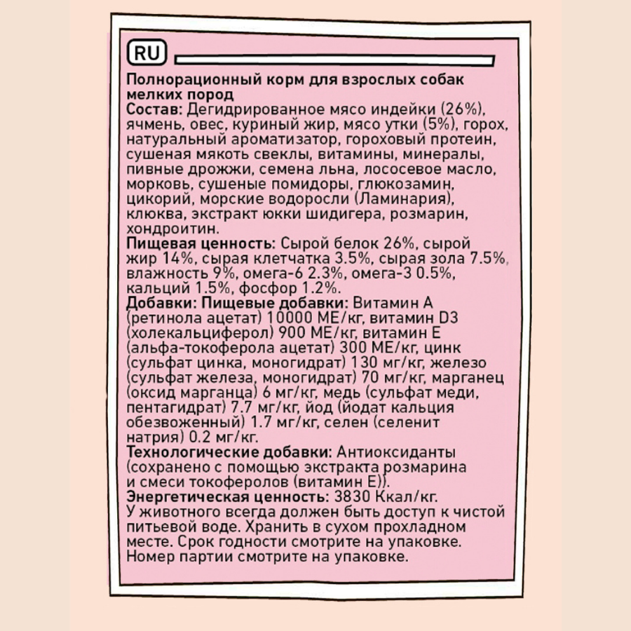 Состав: Дегидрированное мясо индейки (26%), ячмень, овес, куриный жир, мясо утки (5%), горох, натуральный ароматизатор, гороховый протеин, сушеная мякоть свеклы, витамины, минералы, пивные дрожжи,