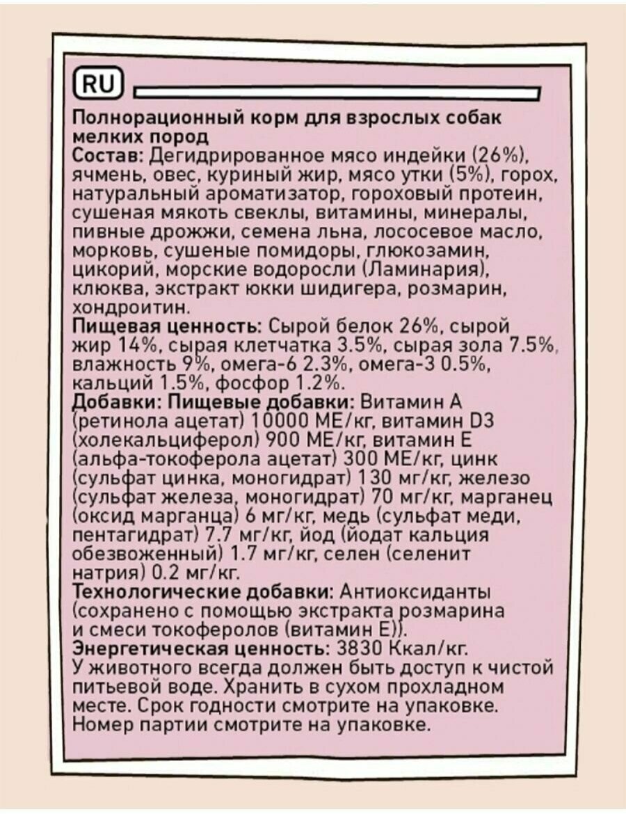 Состав изготовлен на основе мяса индейки – это прекрасный гипоаллергенный компонент и источник животного белка, необходимый для нормальной жизнедеятельности подвижным и энергичным собакам мелких пород.