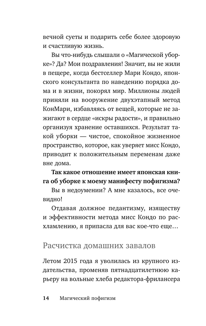 Когда-то бестселлер Мари Кондо "Магическая уборка" помог журналистке и писательнице Саре Найт выкинуть весь хлам и привести дом в идеальный порядок. Этот опыт вдохновил ее полностью изменить свою жизнь: избавиться от бесполезных дел, навязанного чувства вины и нежелательного общения - и направить энергию и время на любимых людей и приятные занятия.
