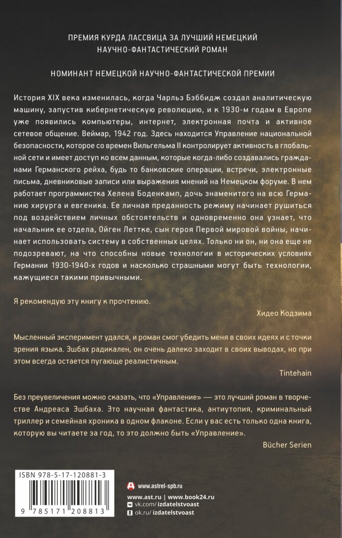 Хорошая книга, как всегда у Эшбаха замечательный сюжет, который заставляет задумываться. Книга о том, что история пошла другим путем, компьютеры в мире начали внедрять еще в начале 20 века, до 1 мировой войны. И как немцы в этом преуспели. Описывается период времени начала и середина второй мировой войны в Германии на примере двух совершенно разных героев, и что с ними стало в условиях тотального контроля. Конечно книга толстовата и многие сцены растянуты (честно, сократила бы). Большинство книг у Эшбаха емкие и хорошо читаются. Но видно автор поддался духу времени, когда модно стало писать ,,кирпичи,, . Но в общем прочитала с удовольствием, хотя хеппи энда и нет. Своих денег книга стоит.