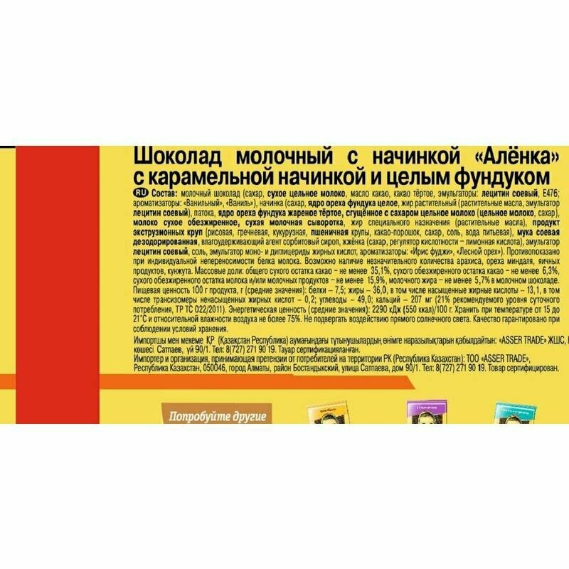 Состав: молочный шоколад (сахар, сухое цельное молоко, масло какао, какао тертое, эмульгаторы: лецитин соевый, Е476; ароматизаторы: Ванильный, Ваниль), начинка (сахар, ядро ореха фундука целое, жир растительный (растительные масла, эмульгатор лецитин соевый), патока, ядро ореха фундука жареное тертое, сгущенное с сахаром цельное молоко (цельное молоко, сахар), молоко сухое обезжиренное, сухая молочная сыворотка, жир специального назначения (растительные масла), продукт экструзионных круп (рисовая, гречневая, кукурузная, пшеничная крупы, какао-порошок, сахар, соль, вода питьевая), мука соевая дезодорированная, влагоудерживающий агент сорбитовый сироп, жженка (сахар, регулятор кислотности: лимонная кислота), эмульгатор лецитин соевый, соль, эмульгатор моно- и диглицериды жирных кислот, ароматизаторы Ирис фуджи, Лесной орех); противопоказано при индивидуальной непереносимости белка молока; возможно наличие незначительного количества арахиса, ореха миндаля, яичных продуктов, кунжута