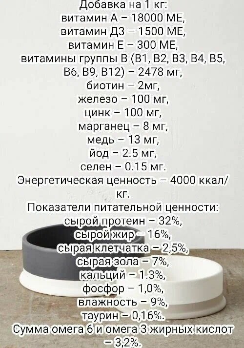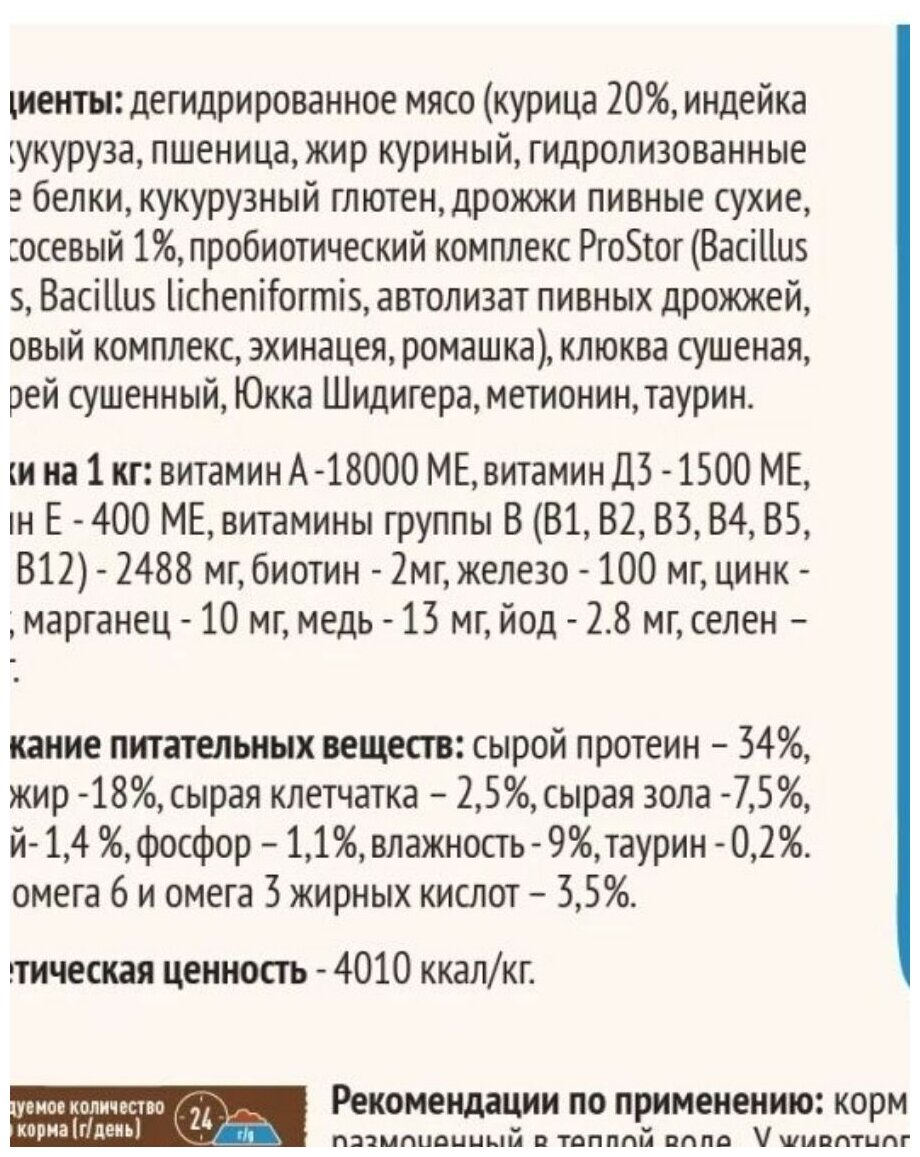 Состав: дегидрированное мясо (курица 20%, индейка 14%), кукуруза, пшеница, жир куриный, гидролизованные мясные белки, кукурузный глютен, дрожжи пивные сухие, жир лососевый 1%, пробиотический комплекс ProStor (Bacillus subtillis, Bacillus licheniformis, автолизат пивных дрожжей, пектиновый комплекс, эхинацея, ромашка), клюква сушеная, сельдерей сушенный, Юкка Шидигера, метионин, таурин.