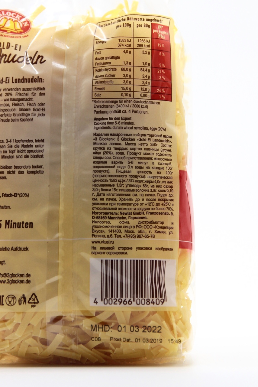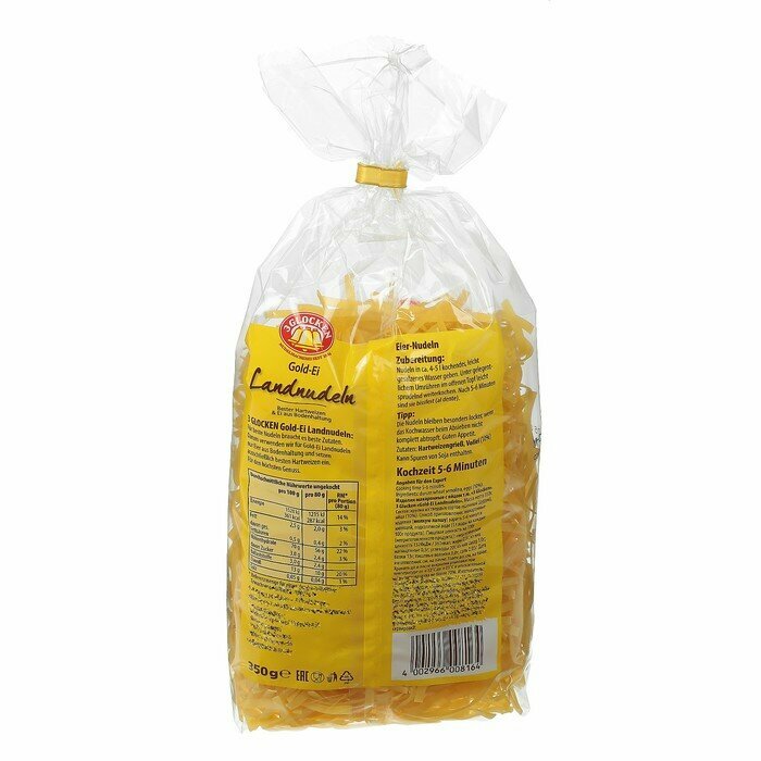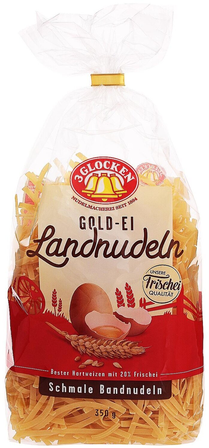 Мелкая лапша бренда 3 Glocken - натуральные макаронные изделия премиум-класса немецкого производства. Производятся из пшеницы твердых сортов (дурум), чистой родниковой воды и отборных свежайших яиц (4 яйца на 1 кг). Это маленькие и тонкие макаронные изделия, похожие на вермишель, только с плоским сечением. Лучше всего мелкая лапша подходит для приготовления первых блюд. Можно использовать в качестве гарнира к основному блюду или ингредиента для салатов. Чтобы получить идеальный вкус, макароны следует варить в соответствии с рекомендациями, указанными на упаковке. Для удобства хранения открытой пачки, упаковка оснащена клипсаторной лентой.