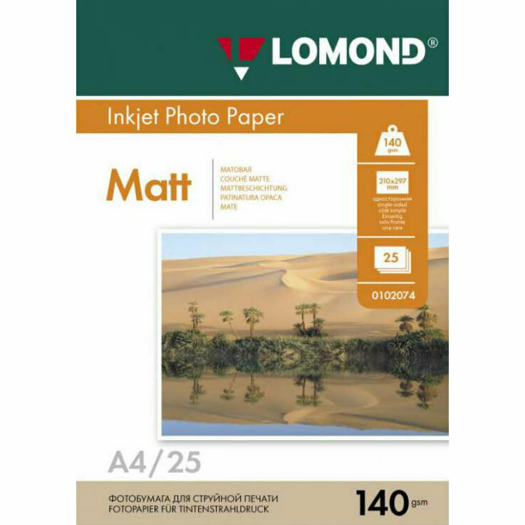 Фотобумага Lomond формат A4, плотность 140г/м2, 25 листов, односторонняя, покрытие матовое, для струйной печати, белый ()