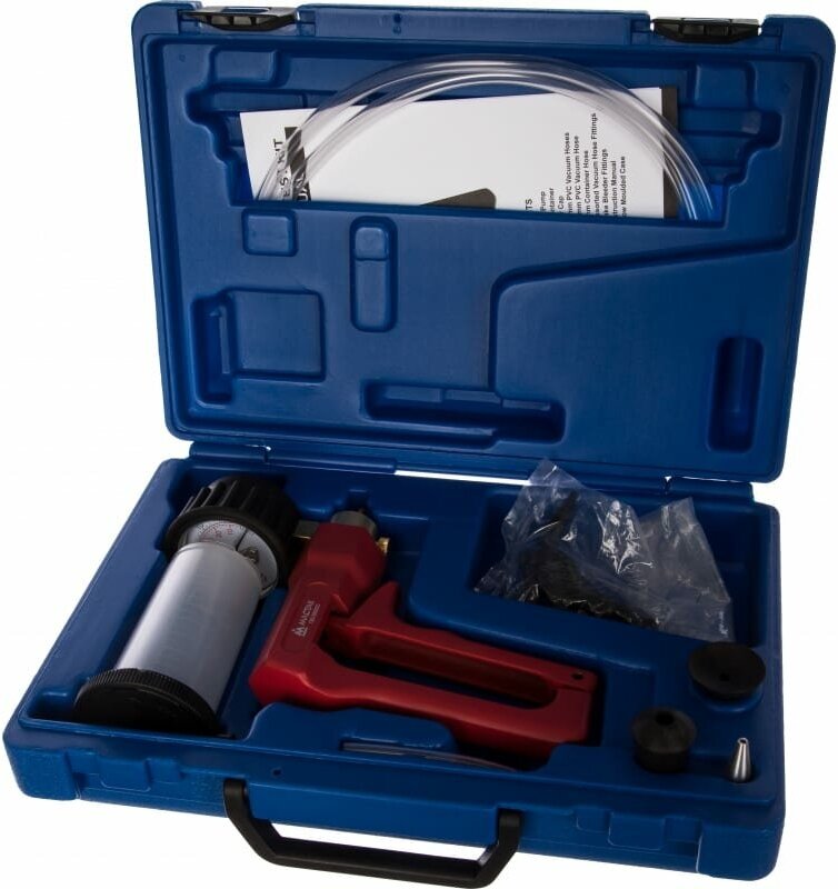 Вакууметр мастак серии применяется для обслуживания двигателей автомобилей, включая инжекторные и карбюраторные системы, в частности для диагностирования: • Тормозной системы • Топливной системы • Вакуумной системы в трансмиссии • Системы охлаждения • Системы кондиционирования • Вакуума клапана турбины • Герметичности выхлопной системы Также применяется для откачки жидкостей, к примеру, для прокачки тормозов. Особенности • Защищённый резиновым кожухом манометр • Клапан сброса разряжения Технические характеристики Создаваемое разряжение от – 1 до 0 бар Что входит в комплект: Пистолет с манометром 1 шт Шланги 500 мм 2 шт Шланги 100 мм 1 шт Шланги 70 мм 1 шт Ёмкость для жидкости 1 шт Различные насадки и адаптеры 15 шт Кейс 1 шт